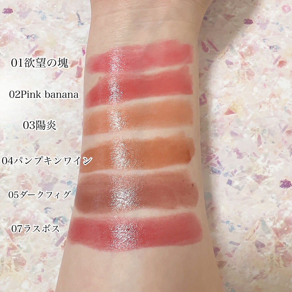 - <01 欲望の塊> テトライソステアリン酸ジペンタエリスリチル、トリ(カプリル酸/カプリン酸)グリセリル、オクチルドデカノール、ラウロイルグルタミン酸ジ(フィトステリル/オクチルドデシル)、ビスアルキル(C16-18)グリセリルウンデシルジメチコン、イソノナン酸イソトリデシル、水添ポリイソブテン、ラウロイルグルタミン酸ジ(オクチルドデシル/フィトステリル/ベヘニル)、パラフィン、合成ワックス、ダイマージリノール酸(フィトステリル/イソステアリル/セチル/ステアリル/ベヘニル)、マイクロクリスタリンワックス、水添マイクロクリスタリンワックス、ヒドロキシステアリン酸エチルヘキシル、トコフェロール、ホホバ種子油、オリーブ果実油、アーモンド油、(エチレン/プロピレン)コポリマー、ポリエチレン、ジメチコン、(+/-)(チタン/酸化チタン)焼結物、マイカ、ラウロイルアスパラギン酸Na、ラウロイルリシン、塩化亜鉛、酸化チタン、酸化鉄、水酸化Al、硫酸Ba、トリイソステアリン酸イソプロピルチタン、酸化スズ、ホウケイ酸(Ca/Al)、合成フルオロフロゴパイト、黄4、黄5、赤104(1)、赤201、赤202 <02 ピンクバナナ> テトライソステアリン酸ジペンタエリスリチル、トリ(カプリル酸/カプリン酸)グリセリル、オクチルドデカノール、ラウロイルグルタミン酸ジ(フィトステリル/オクチルドデシル)、ビスアルキル(C16-18)グリセリルウンデシルジメチコン、イソノナン酸イソトリデシル、水添ポリイソブテン、ラウロイルグルタミン酸ジ(オクチルドデシル/フィトステリル/ベヘニル)、パラフィン、合成ワックス、ダイマージリノール酸(フィトステリル/イソステアリル/セチル/ステアリル/ベヘニル)、マイクロクリスタリンワックス、水添マイクロクリスタリンワックス、ヒドロキシステアリン酸エチルヘキシル、トコフェロール、ホホバ種子油、オリーブ果実油、アーモンド油、(エチレン/プロピレン)コポリマー、ポリエチレン、ジメチコン、(+/-)(チタン/酸化チタン)焼結物、マイカ、ラウロイルアスパラギン酸Na、ラウロイルリシン、塩化亜鉛、酸化チタン、酸化鉄、水酸化Al、硫酸Ba、トリイソステアリン酸イソプロピルチタン、酸化スズ、ホウケイ酸(Ca/Al)、合成フルオロフロゴパイト、黄4、黄5、赤104(1)、赤201、赤202 <03 陽炎> テトライソステアリン酸ジペンタエリスリチル、トリ(カプリル酸/カプリン酸)グリセリル、オクチルドデカノール、ラウロイルグルタミン酸ジ(フィトステリル/オクチルドデシル)、ビスアルキル(C16-18)グリセリルウンデシルジメチコン、イソノナン酸イソトリデシル、水添ポリイソブテン、ラウロイルグルタミン酸ジ(オクチルドデシル/フィトステリル/ベヘニル)、パラフィン、合成ワックス、ダイマージリノール酸(フィトステリル/イソステアリル/セチル/ステアリル/ベヘニル)、マイクロクリスタリンワックス、水添マイクロクリスタリンワックス、ヒドロキシステアリン酸エチルヘキシル、トコフェロール、ホホバ種子油、オリーブ果実油、アーモンド油、(エチレン/プロピレン)コポリマー、ポリエチレン、ジメチコン、(+/-)(チタン/酸化チタン)焼結物、マイカ、ラウロイルアスパラギン酸Na、ラウロイルリシン、塩化亜鉛、酸化チタン、酸化鉄、水酸化Al、硫酸Ba、トリイソステアリン酸イソプロピルチタン、酸化スズ、ホウケイ酸(Ca/Al)、合成フルオロフロゴパイト、黄4、黄5、赤104(1)、赤201、赤202 <04 パンプキンワイン> テトライソステアリン酸ジペンタエリスリチル、トリ(カプリル酸/カプリン酸)グリセリル、オクチルドデカノール、ラウロイルグルタミン酸ジ(フィトステリル/オクチルドデシル)、ビスアルキル(C16-18)グリセリルウンデシルジメチコン、イソノナン酸イソトリデシル、水添ポリイソブテン、ラウロイルグルタミン酸ジ(オクチルドデシル/フィトステリル/ベヘニル)、パラフィン、合成ワックス、ダイマージリノール酸(フィトステリル/イソステアリル/セチル/ステアリル/ベヘニル)、マイクロクリスタリンワックス、水添マイクロクリスタリンワックス、ヒドロキシステアリン酸エチルヘキシル、トコフェロール、ホホバ種子油、オリーブ果実油、アーモンド油、(エチレン/プロピレン)コポリマー、ポリエチレン、ジメチコン、(+/-)(チタン/酸化チタン)焼結物、マイカ、ラウロイルアスパラギン酸Na、ラウロイルリシン、塩化亜鉛、酸化チタン、酸化鉄、水酸化Al、硫酸Ba、トリイソステアリン酸イソプロピルチタン、酸化スズ、ホウケイ酸(Ca/Al)、合成フルオロフロゴパイト、黄4、黄5、赤104(1)、赤201、赤202 <05 ダークフィグ> テトライソステアリン酸ジペンタエリスリチル、トリ(カプリル酸/カプリン酸)グリセリル、オクチルドデカノール、ラウロイルグルタミン酸ジ(フィトステリル/オクチルドデシル)、ビスアルキル(C16-18)グリセリルウンデシルジメチコン、イソノナン酸イソトリデシル、水添ポリイソブテン、ラウロイルグルタミン酸ジ(オクチルドデシル/フィトステリル/ベヘニル)、