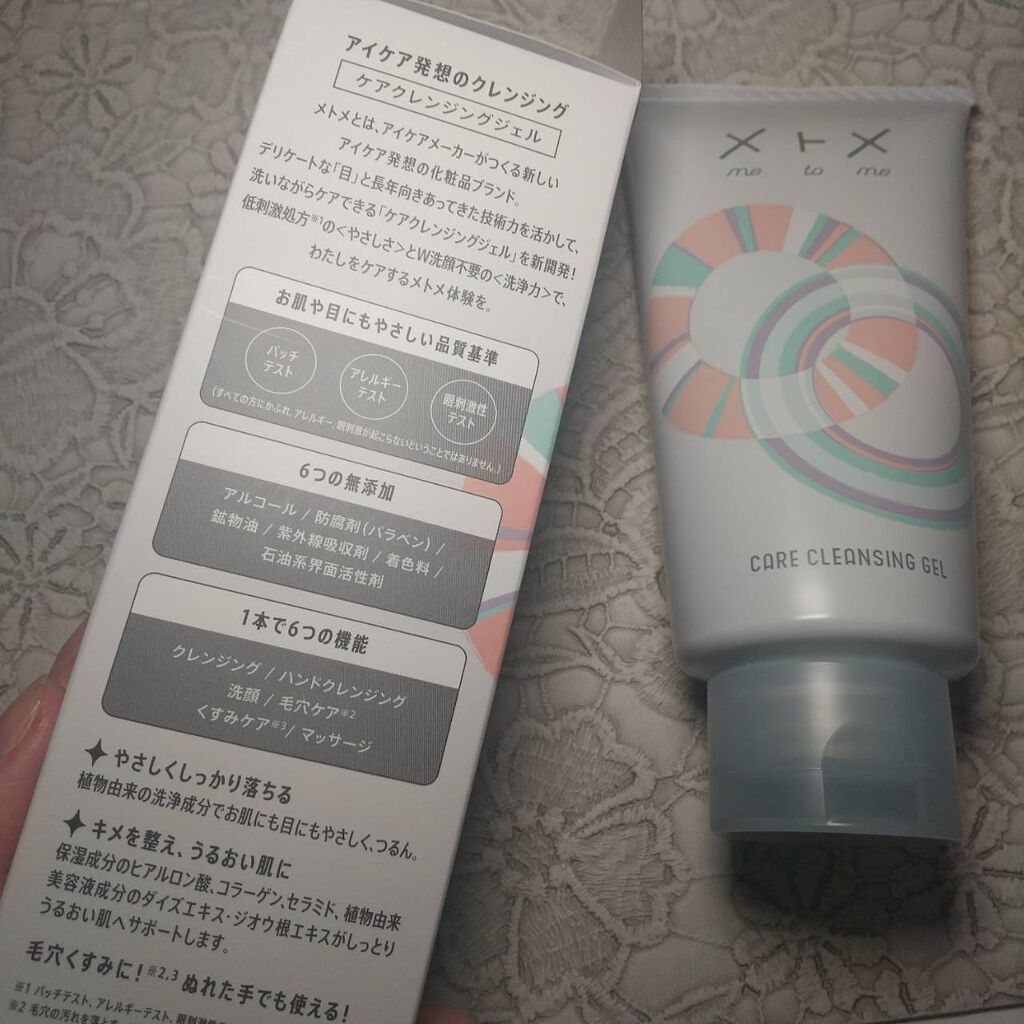 - 『ケアクレンジングジェル メトメ』は、肌にやさしいことはもちろん、メイクのポイントとしても欠かせない「目」にもやさしいクレンジングです。クレンジングの中でも摩擦の少ないジェルタイプで、皮膚がうすい目元でもやさしく洗うことができます。また、目に入ってもしみにくい低刺激処方で、目の際まですっきり洗うことができます。