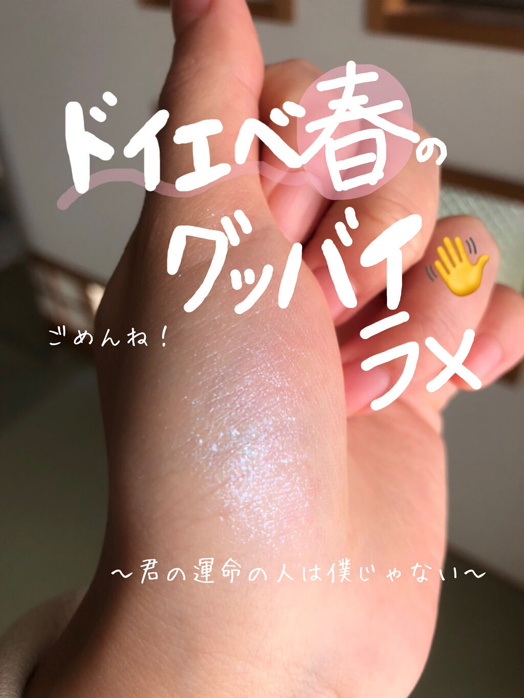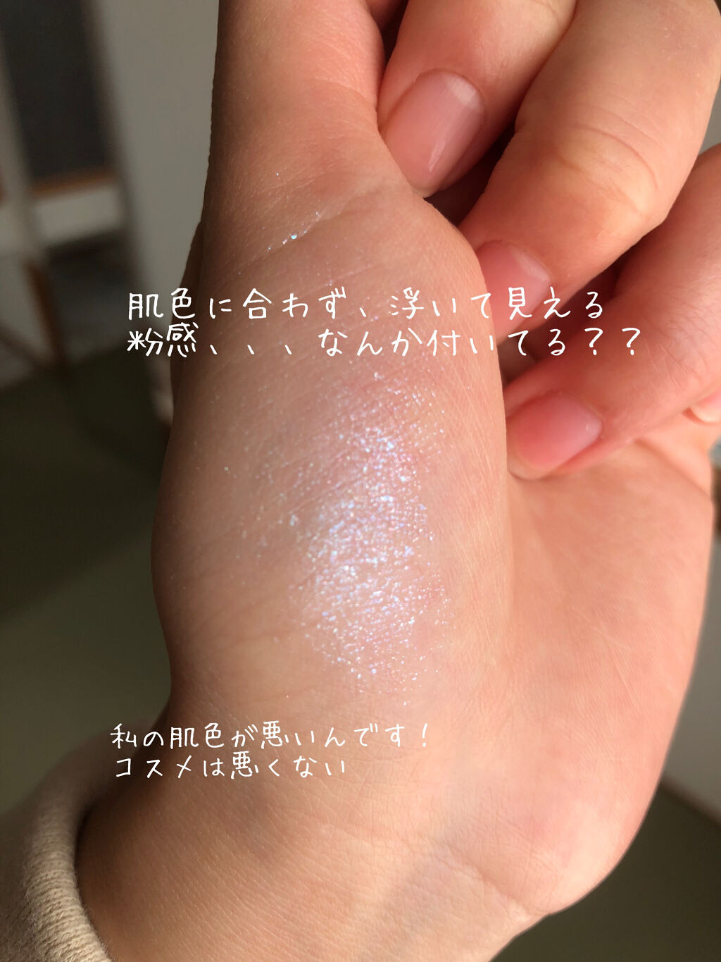 輝きだけをのせる! ベースカラーは透明でラメだけを楽しむアイシャドウ♡ 「01 イノセントクリスタル」というカラーは白みシルバーのラメでイエベ肌に塗るとちょっぴり水色に見えたよ〜! ラメのサイズは大小2種類で重ねて楽しめるらしい。