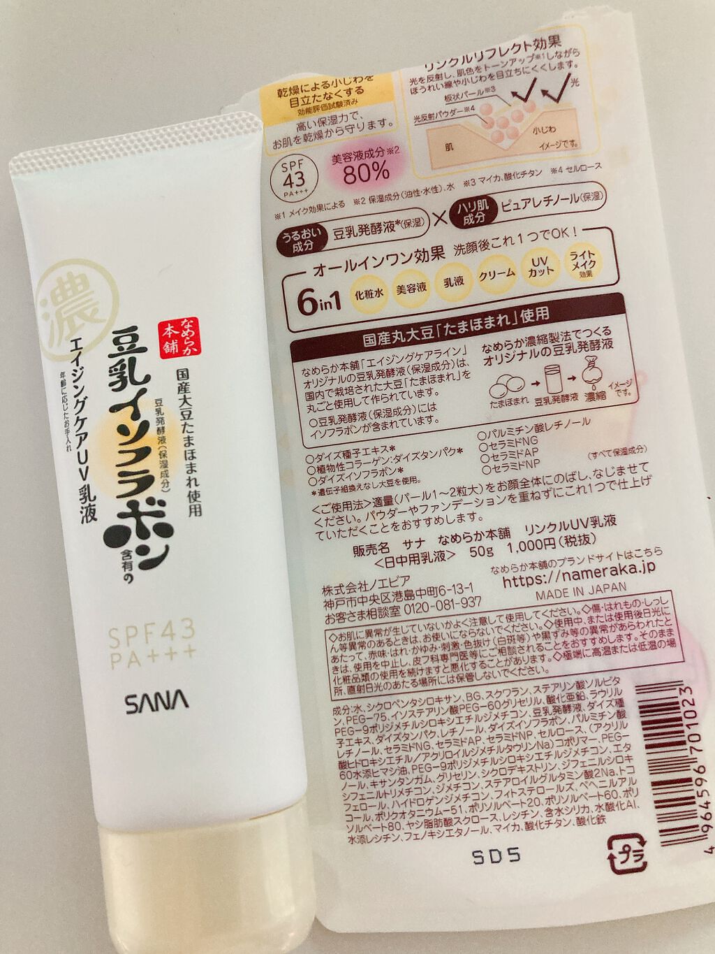 - ほうれい線・小じわのメイクよれが気になる方におすすめの日中用カバーUV 乳液です。リニューアルしたなめらか本舗エイジングケア*1ライン共通の、滋賀県産たまほまれ使用の豆乳発酵液*2とピュアレチノール*2を配合しています。リンクルリフレクト効果で、ほうれい線や小じわを目立たなくし、時間が経ってもメイクよれが気にならない処方を採用しました。お肌にうれしいノンケミカル(紫外線吸収剤不使用)処方で、洗顔後これ 1 つでスキンケアからベースメイクまで完成。 乾燥による小じわを目立たなくします(効能評価試験済み)。 SPF43・PA+++、石けんでオフできます。 *1年齢に応じたお手入れ *2保湿成分