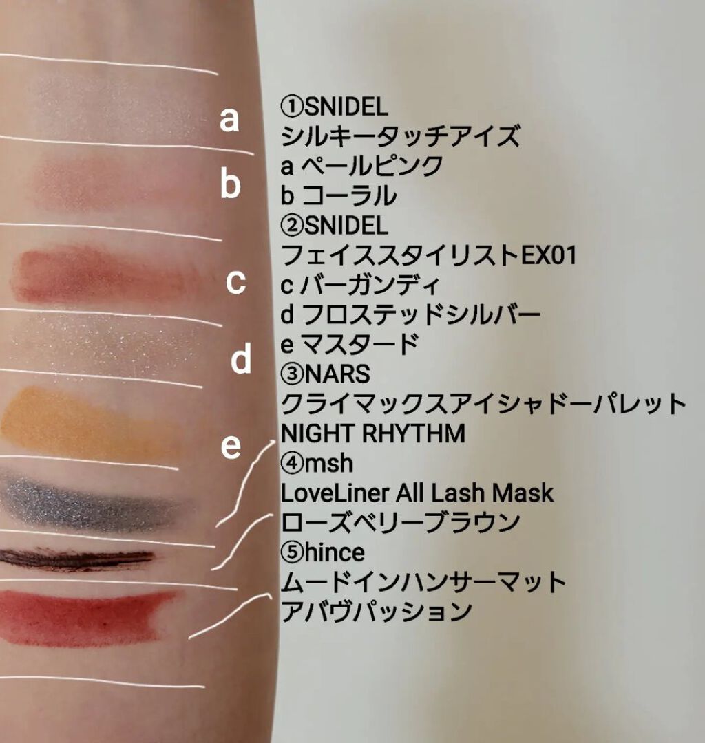 アイブロウは #WHOMEE のレッドブラウンを。 アイメイクは ①#hince の #ニューデップスアイシャドウ イニシャルを上下の瞼に馴染ませる。 ②#snidelbeauty の #フェイススタイリスト の a バーガンディを上瞼の際に 目尻から黒目上あたりまで。 b マスタードを同じく上瞼の際の目頭から 黒目上あたりまで。 c スパークリングゴールドを下瞼の黒目下に。 d フロステッドシルバーをcの両隣に✨ リップとチークは ④#rmsbeauty の #ラプチャー を唇にポンポン塗りにする。 指で馴染ませたら、指についてる残りを頬にも♡ ヘアスタイルは ちょっと変化を付けたくて 少しコテを使って ウルフっぽい形に。 アルジェランの ヘアバームとヘアオイルをほんの少し MIXしてスタイリング💆 #アルジェランヘアバーム → 9/11発売! #モイストグローヘアオイル →既に発売されているもの アウトバスだけでなくスタイリングにも オススメです🙆