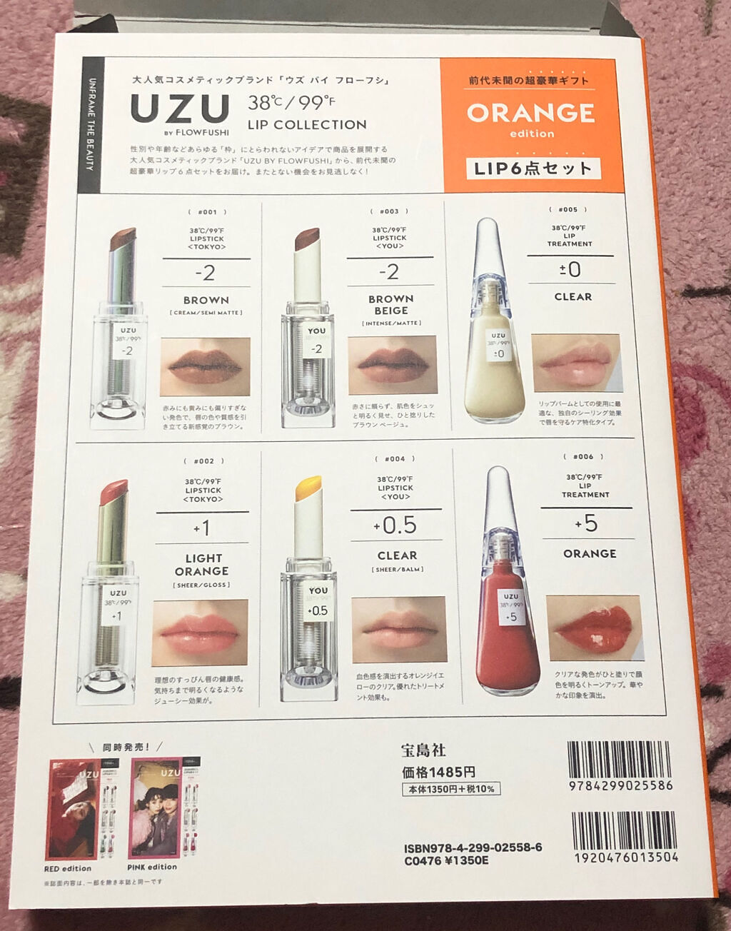 ウズのリップがなんと6点も入ったUZU BY FLOWFUSHI LIP COLLECTION という超豪華な本が明日から発売されます♪ ウズのリップって定価だと1本2000円くらいするのに、それがなんと6本も入って1485円なんです!! オレンジ・レッド・ピンクの3種類あるのですが、ピンクが一番人気だったらしく、12月29日に本屋さんに予約しに行ったら、もうピンクの予約注文は出来なくなっていました。 オレンジとレッドは予約注文できて買えたので、めっちゃ嬉しかったです(๑>∀<๑)/
