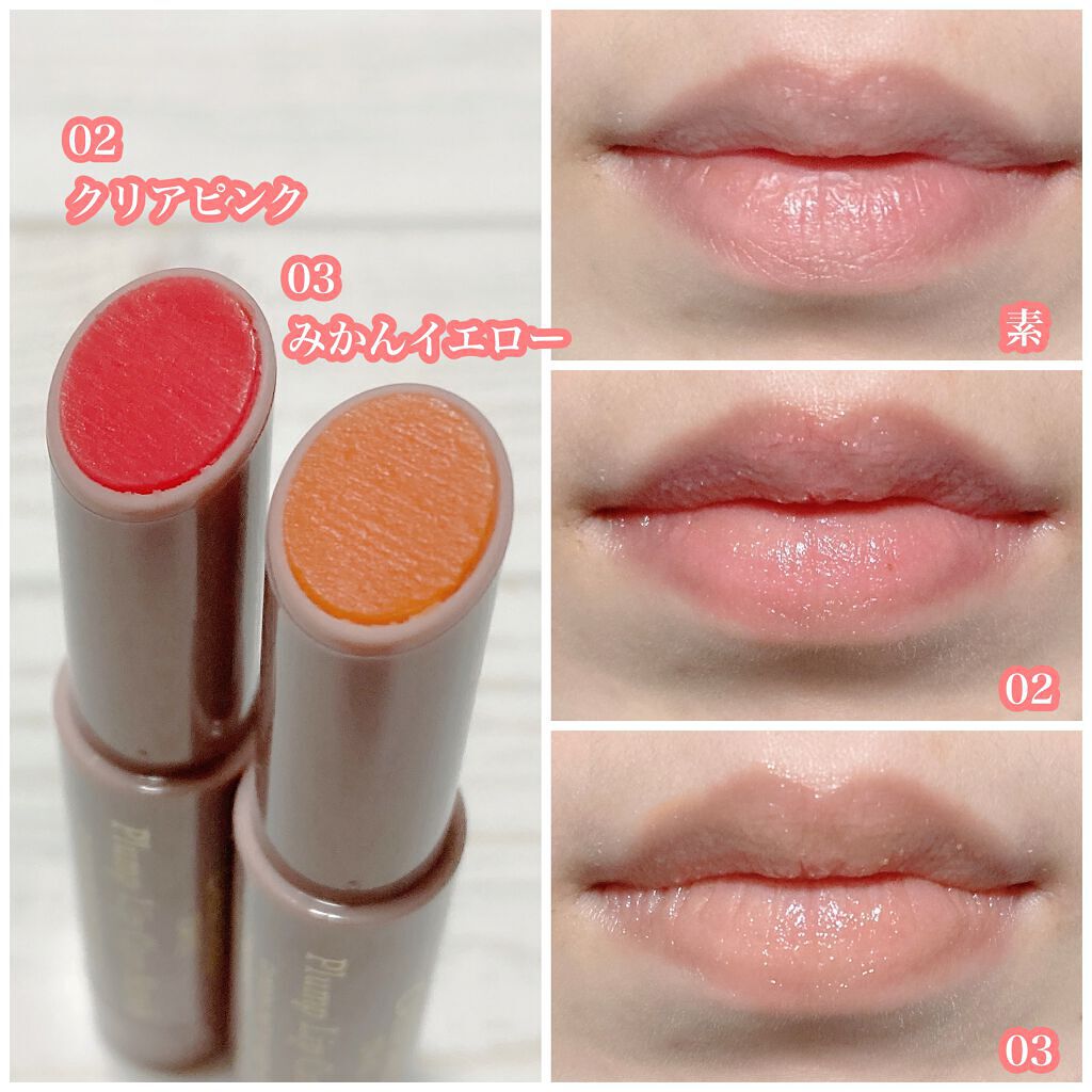 粒が大きすぎなくて塗りやすい プランプ効果も少しあるから、より縦じわにいい 03みかんイエローの方は色がほんのり付く サッと塗るのにちょうどいいコスメ 縦じわが気になる人にオススメ
