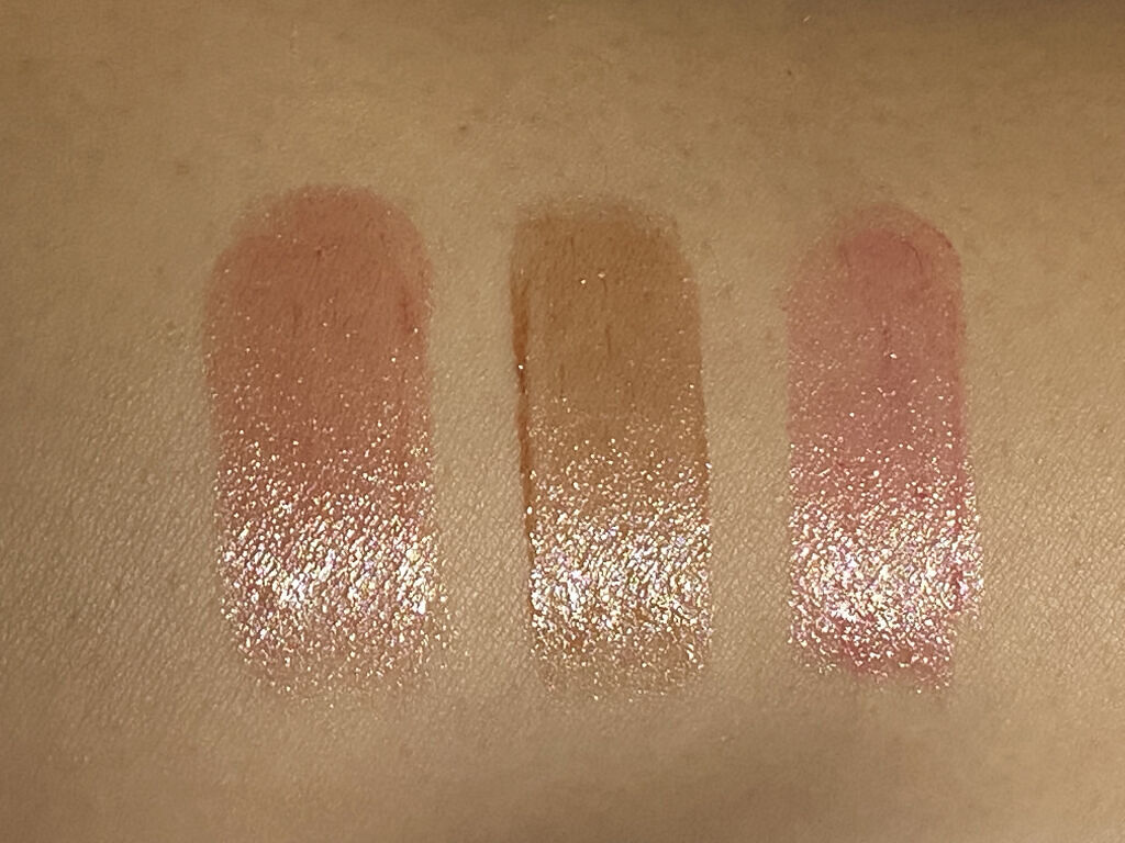 【color】左上:彩度低めのシマーゴールドベージュ右上:ラメが入っている明るめ黄味強めゴールドベージュ左下:小さな偏光ラメいり暗め黄味薄めベージュ右下:一気に垢抜けるシマーシアーカーキ 【quality】しっとりしていて良いです!ただ、少しラメが飛び散る気がします! 【like】今日はそんなに濃いメイクはいいかな…みたいな日に(わたしは色が肌に馴染むので)ささっと塗るとナチュラルだけどシマーとラメでメイクしてるのは伝わります!カーキもアイライナーとして引くとなんだか上級者に見えます!上まぶたに入れるとスモーキーなメイクに仕上がります!いろんな風に支えてすきです! 【not like】ラメが顔中につきます!日向に当たると顔が輝いている人になります!めっちゃ盛りたい日にはナチュラルすぎです!