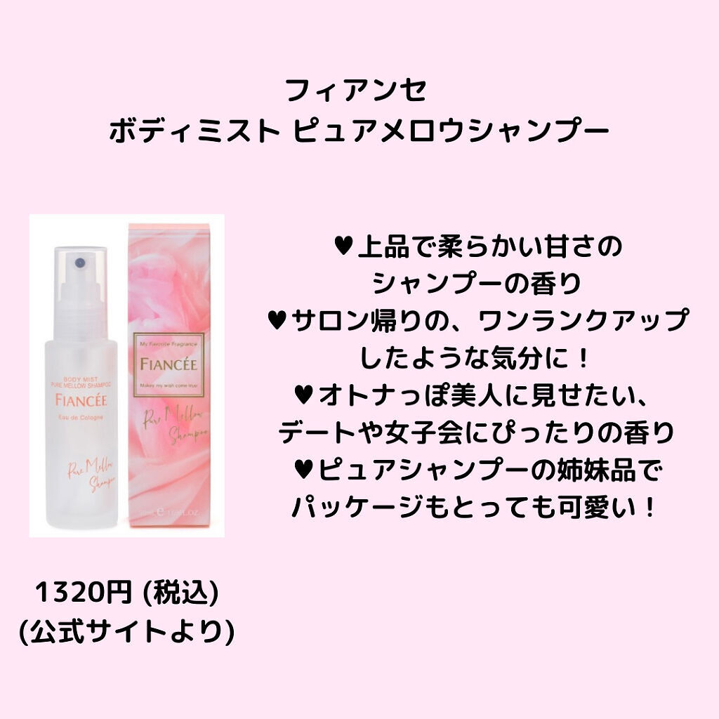 フィアンセボディミストピュアメロウシャンプー¥1,320✼••┈┈••✼••┈┈••✼••┈┈••✼••┈┈••✼香水は普段つけることあまりないけど、街中ですれ違ったときとかふわっといい香りがするの素敵だなぁと思ったのと、可愛いパッケージにつ...