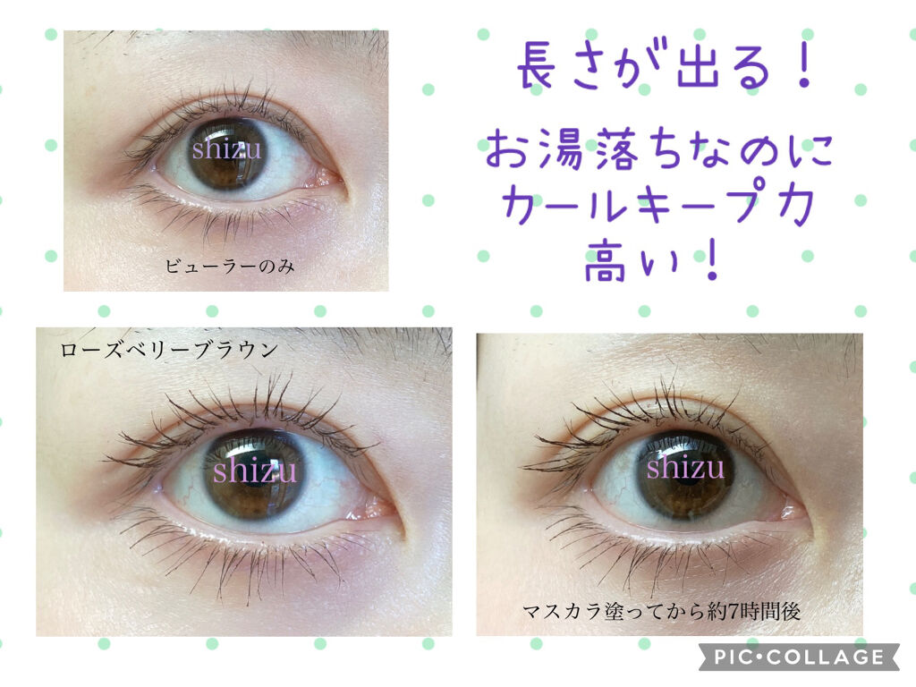 まず色が可愛い💕 赤みブラインなので秋メイクにもピッタリ だと思います🌰 ふわっと自まつ毛に近い塗り心地です。ダマにもなりづらく塗りやすい😌 オフが楽!! ついポイントリムーバーを忘れてお風呂に入ってしまった時にウォータープルーフだと落とせなくて、結局お風呂出た後に落とす😮💨ってことがないのが良い🥺✨ マイナスポイントとしては、オフが楽な分、涙とか水分や擦れには弱いかな🤔 泣いてしまった日があったんだけど、結構落ちて目の下にマスカラが付いちゃってました💦