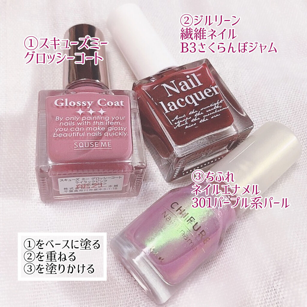 ※2022年12月開封品ネイルカラー・商品名jillleen.(ジルリーン)繊維ネイルマニキュアポリッシュB8カシスジャム・値段定価990円・購入場所アインズ&トルペ・評価★★★☆☆ベースの色はほとんど出ないからベースにラベンダーピンクみたい...