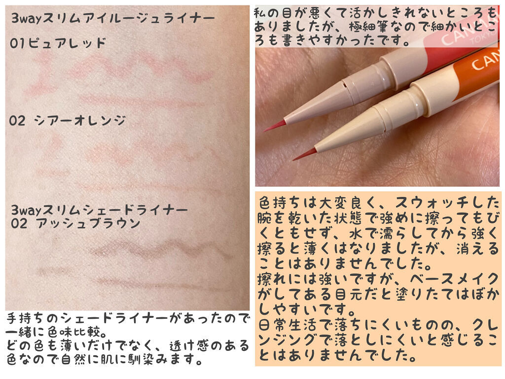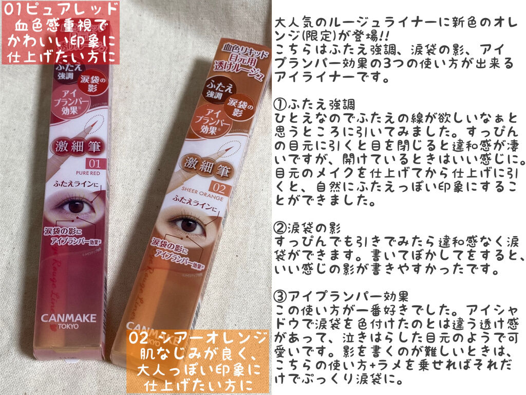 - ふたえ強調・涙袋の影・アイプランパー効果(※)に使える 激細筆の目元用透けルージュライナー 自然でリアルな血色を叶える、絶妙な透け発色ライナー♥ まるで目元にルージュを塗ったかのように血色感を与え、かわいい印象に仕上がります。 描いた線が太くならないよう、筆を根元から細くして 描きやすい距離と適度なコシになるように、短い筆に仕上げました。 汗・皮脂・こすれに強く、朝描いたラインも長時間キープされます。 (※メイクアップ効果による)