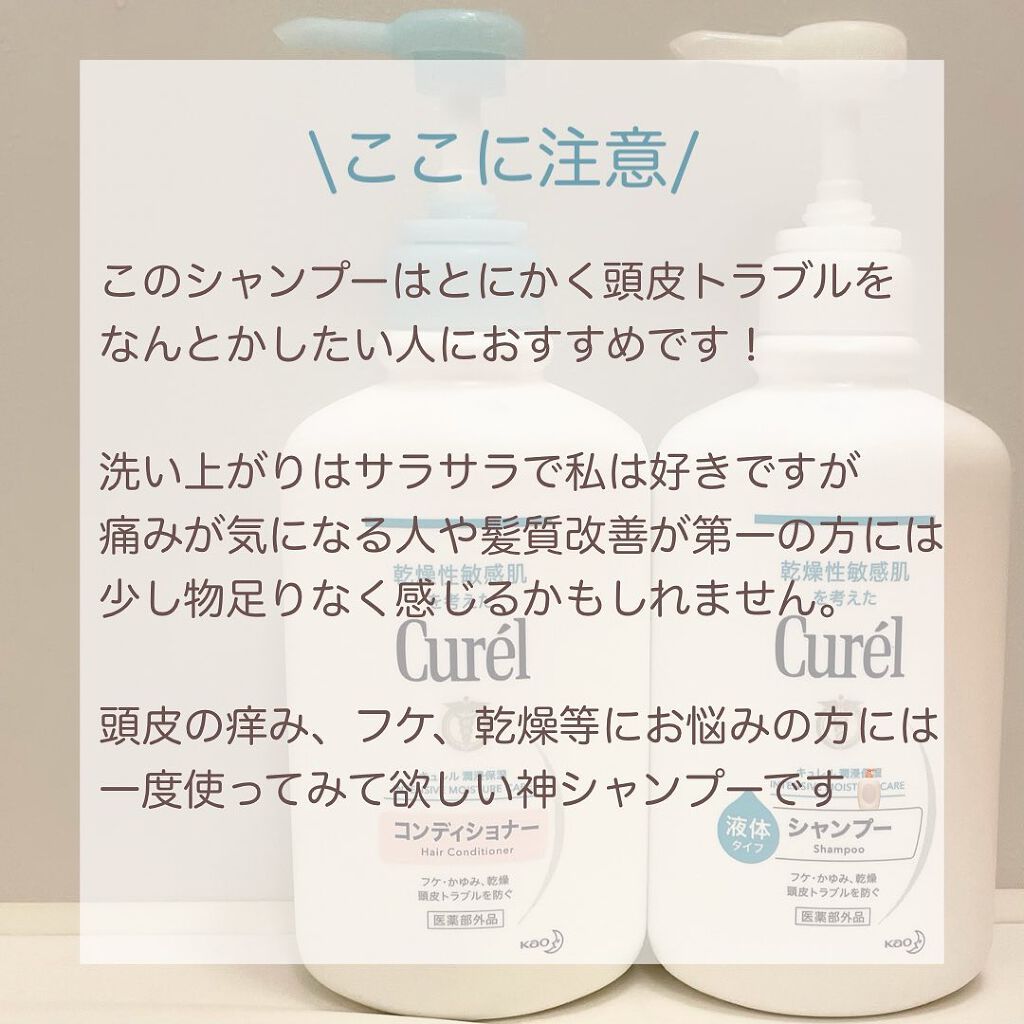 キュレルは乾燥性敏感肌の人のために作られたブランドでスキンケアが有名ですよね。 購入の決め手は以下の3つの効果でした(花王HPより抜粋) 洗い上がりはさっぱりしていて頭皮の無駄な汚れや皮脂がするんと落ちる感じ。 しばらく使うと掻きむしってできた頭皮の出来物もなくなっていて、痒みも全くなくなってました! 注意点を挙げるならこの商品は頭皮トラブルのために作られたものなので傷んだ髪の修復等の髪質改善については効果は薄めかも… 反対に髪がベタついちゃう方には指通りよくサラサラになるのでおすすめです🙆♀️