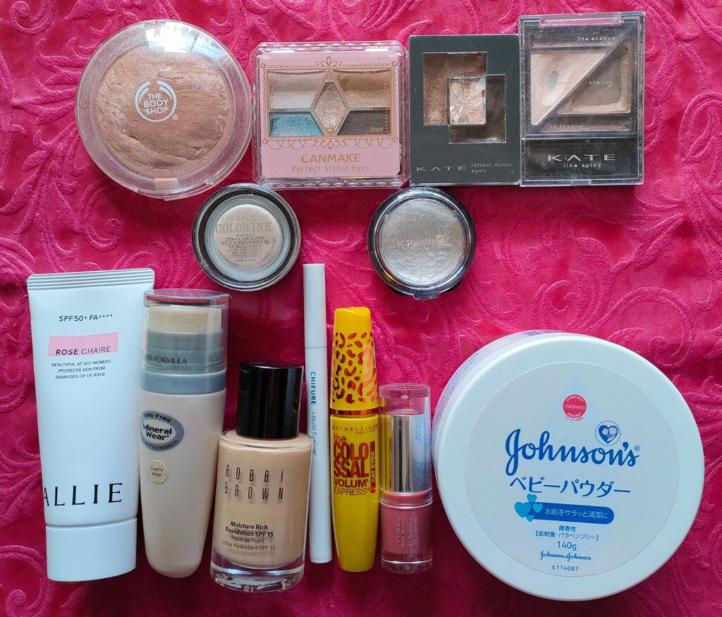 アリィー ニュアンスチェンジUV ジェル RSを、顔全体にまんべんなく塗ります。 RMK RMK ジェルクリーミィファンデーション 103を、顔全体にまんべんなく塗ります。 ジョンソンベビー ジョンソン ベビーパウダーを、顔全体にまんべんなく軽くはたきます。 THE BODY SHOP bronze shade warm glowを、両頬に塗ります。 KATE リフレクトミラーアイズ BR-1の締め色を、眉毛全体にまんべんなく塗ります。 URGLAM UR GLAMBLOOMING EYE COLOR PALETTE 01を、使用しました。 ちふれ リキッド アイライナー 筆ペンタイプ BK30 ブラックを、塗ります。 CEZANNE エアリーカールマスカラを、まつ毛全体にまんべんなく塗ります。 MAYBELLINE NEW YORK コロッサルボリュームエクスプレスを、まつ毛全体にまんべんなく塗ります。 MAYBELLINE NEW YORK SPステイ マットインク 135を、唇全体にまんべんなく塗ります。