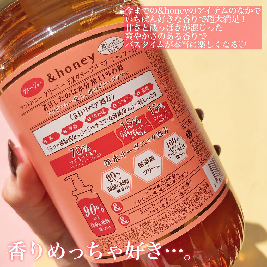 - 髪の水分量14%に着目し、ダメージを保水力でケアする「新ハチミツダメージケア」のシャンプー・ヘアトリートメント。製品の90%以上をハチミツや高保湿ヒアルロン酸などの保湿&補修成分で構成。 ハチミツのチカラと「5Dリペア処方」を導入し、 ・熱 ・摩擦 ・紫外線 ・ヘアカラー ・乾燥 の5つの要因によるダメージをケア。毛先まで超しっとりまとまる髪へ仕上げます。 無添加フリー処方※。 シャンプー:ジューシーベリーハニーの香り、ヘアトリートメント:フレンチベリーハニーの香り。 ※サルフェート、PG、パラベン、鉱物油、動物実験フリー