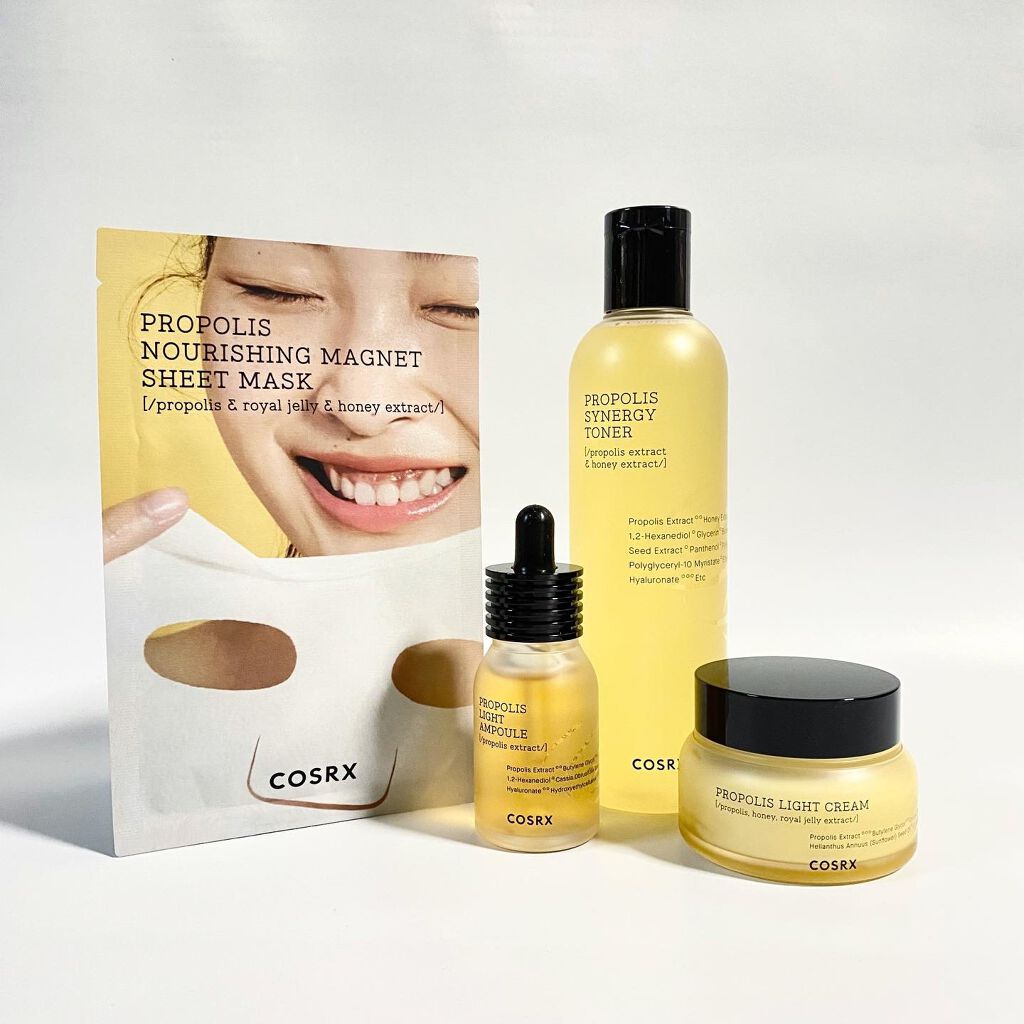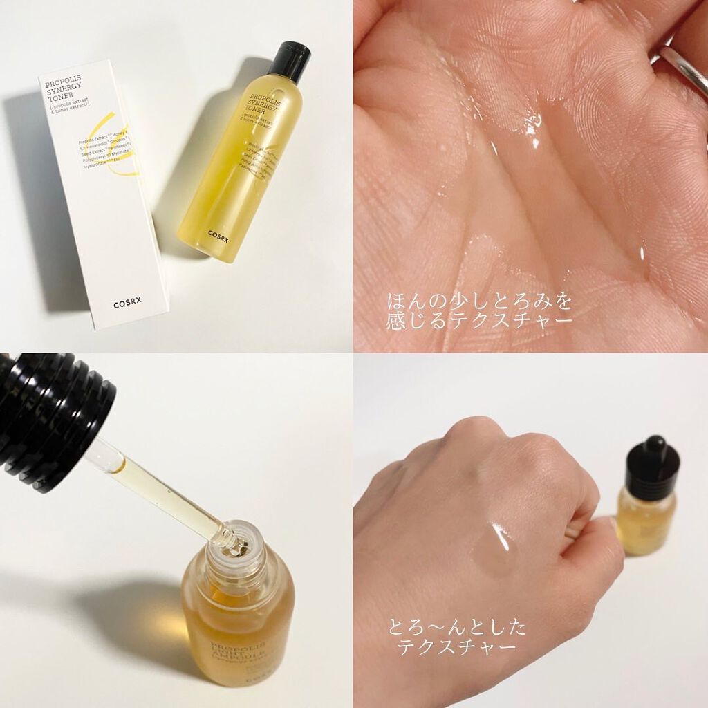 プロポリスエキスがトナー・・72.6% アンプル・・83%だそうです。 香りはほぼないです。めっちゃ使いやすい。 トナーはどっちかというとシャバシャバ系のテクスチャー。 特に化粧水はストック買いしたいと思うほどに気に入った💞