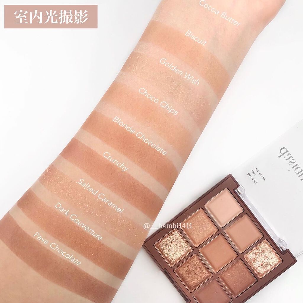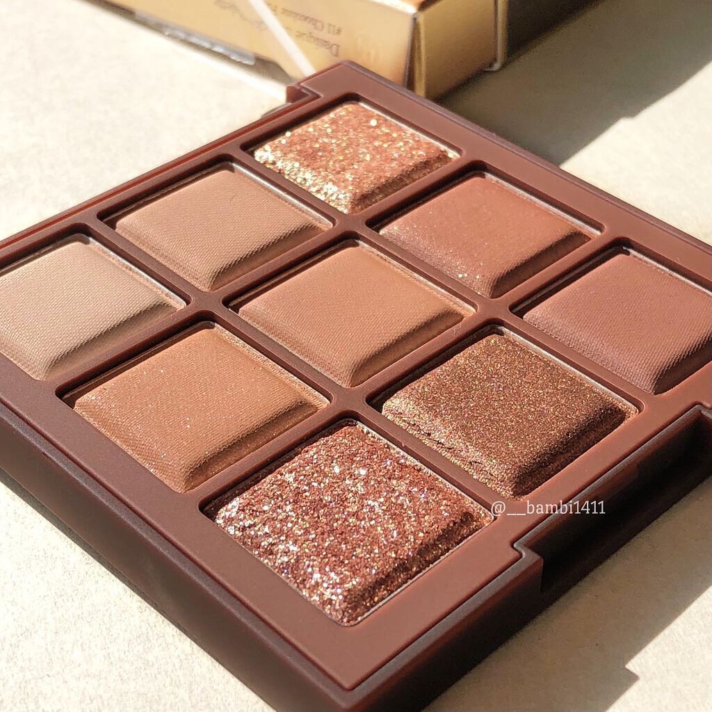甘くとろけるようなチョコレートモチーフのアイシャドウ🍫を今日はレポするよ📢 捨て色なしの9色パレット🍫 見た目もチョコレートだけど香りもほんのりチョコレートの香りなの🥺💕 肌馴染み良いブラウンでデイリーに使いやすいのも🙆♀️