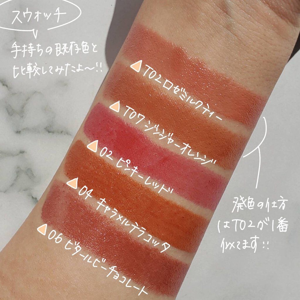 - <T02 ロゼミルクティー> トリエチルヘキサノイン、リンゴ酸ジイソステアリル、ワセリン、イソステアリン酸水添ヒマシ油、ダイマージリノール酸水添ヒマシ油、合成ワックス、ヘキサ(ヒドロキシステアリン酸/ステアリン酸/ロジン酸)ジペンタエリスリチル、ミツロウ、(HDI/トリメチロールヘキシルラクトン)クロスポリマー、メタクリル酸メチルクロスポリマー、(エチレン/プロピレン)コポリマー、ミネラルオイル、キャンデリラロウエステルズ、ヒマワリ種子ロウ、ペンタステアリン酸ポリグリセリル-10、トコフェロール、グリチルレチン酸ステアリル、スクワラン、セラミドNP、ナイアシンアミド、酸化チタン、黄4、酸化鉄、赤201、青1、赤202、水酸化Al、赤223 <T03 ディアレストレッド> トリエチルヘキサノイン、リンゴ酸ジイソステアリル、ワセリン、イソステアリン酸水添ヒマシ油、ダイマージリノール酸水添ヒマシ油、合成ワックス、ヘキサ(ヒドロキシステアリン酸/ステアリン酸/ロジン酸)ジペンタエリスリチル、ミツロウ、(HDI/トリメチロールヘキシルラクトン)クロスポリマー、メタクリル酸メチルクロスポリマー、(エチレン/プロピレン)コポリマー、ミネラルオイル、キャンデリラロウエステルズ、ヒマワリ種子ロウ、ペンタステアリン酸ポリグリセリル-10、トコフェロール、グリチルレチン酸ステアリル、スクワラン、セラミドNP、ナイアシンアミド、黄4、酸化チタン、赤201、赤202、酸化鉄、赤223、水酸化Al <T04 スウィートガナッシュ> トリエチルヘキサノイン、リンゴ酸ジイソステアリル、ワセリン、イソステアリン酸水添ヒマシ油、ダイマージリノール酸水添ヒマシ油、合成ワックス、ヘキサ(ヒドロキシステアリン酸/ステアリン酸/ロジン酸)ジペンタエリスリチル、ミツロウ、(HDI/トリメチロールヘキシルラクトン)クロスポリマー、メタクリル酸メチルクロスポリマー、(エチレン/プロピレン)コポリマー、ミネラルオイル、キャンデリラロウエステルズ、ヒマワリ種子ロウ、ペンタステアリン酸ポリグリセリル-10、トコフェロール、グリチルレチン酸ステアリル、スクワラン、セラミドNP、ナイアシンアミド、酸化鉄、酸化チタン、黄4、赤202、赤223、水酸化Al、赤201 <T06 サクラエンジェル> トリエチルヘキサノイン、リンゴ酸ジイソステアリル、ワセリン、イソステアリン酸水添ヒマシ油、ダイマージリノール酸水添ヒマシ油、合成ワックス、ヘキサ(ヒドロキシステアリン酸/ステアリン酸/ロジン酸)ジペンタエリスリチル、ミツロウ、(HDI/トリメチロールヘキシルラクトン)クロスポリマー、メタクリル酸メチルクロスポリマー、(エチレン/プロピレン)コポリマー、ミネラルオイル、キャンデリラロウエステルズ、ヒマワリ種子ロウ、ペンタステアリン酸ポリグリセリル-10、トコフェロール、グリチルレチン酸ステアリル、スクワラン、セラミドNP、ナイアシンアミド、酸化チタン、水酸化Al、赤223、赤104(1)、黄4、赤201