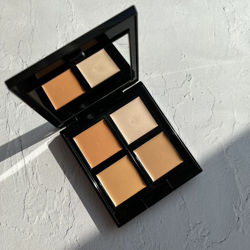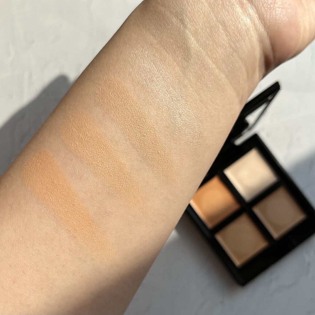 コントロールカラーとハイライトカラーがひとつになった4色のコンシーラーパレット🎨 濃いめシミ・クマは完全には隠せませんが密着度が高く崩れにくく色持ちがいいです 右上ハイライトカラーはナチュラルな仕上がりで上品な優しいツヤを演出してくれます☺️ 大きめの鏡が付いているのが嬉しいポイント🪞 崩れにくいコンシーラーをお探しの方におすすめです♪