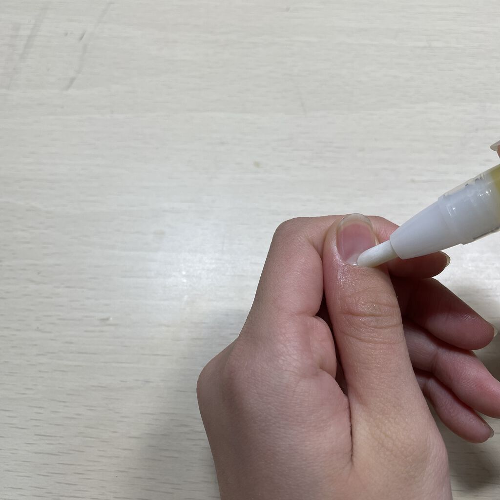 持ち歩き用で使っています。ペンのような形で先は刷毛になっています。 スキマ時間にササッと塗れて、オイルがサラサラではないので垂れたりすることもありません。 黄色の方は甘皮ケアオイルで、こちらはお家で使っています。