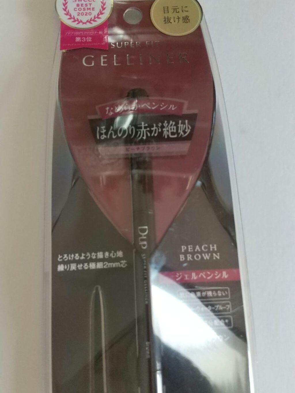 するする書ける繰り出しタイプのジェルライナーです 使用感はとてもよく、落ちにくくてさすがD-UPと思いました! 色味はピーチブラウンなのですが、ほんのり赤みを感じるかなという感じで、結構ブラウンブラック寄りで、ピーチ感は感じませんでした。