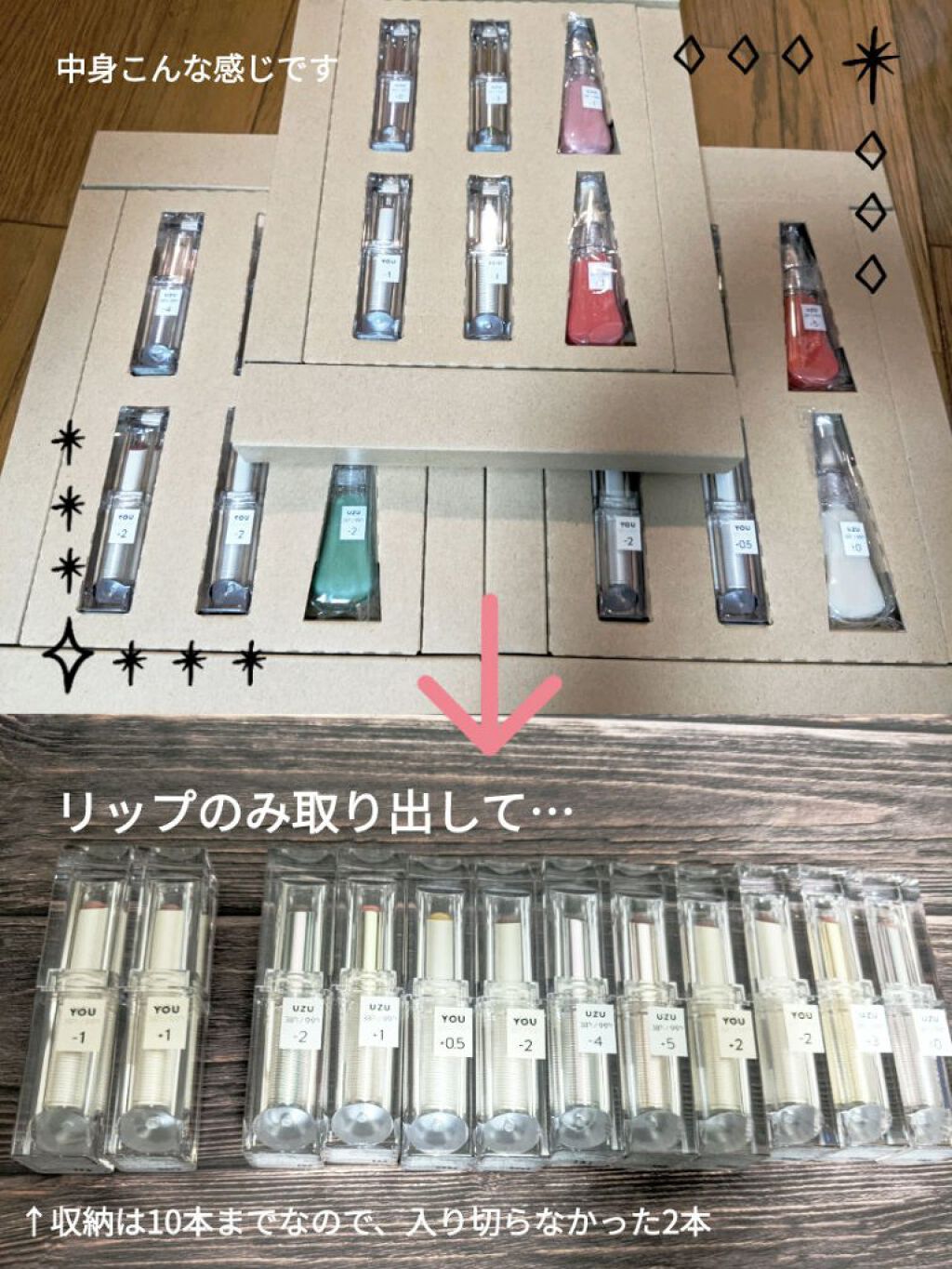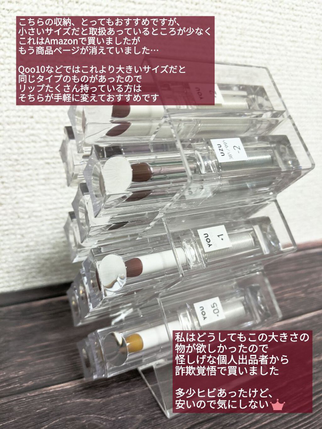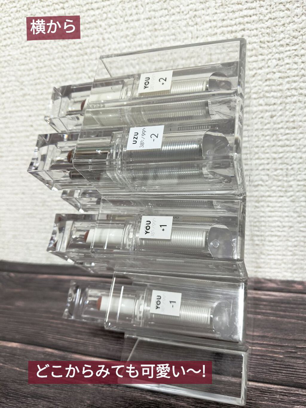 中国のインテリア雑貨通販でよく見るリップスタンドの一番小さいサイズをゲットしました! ちゃんと商品画像通りの品物が届いて安心しました😅ちょっと傷がありましたが写真ではわからなくらい、キレイなアクリルでした✨ UZUのリップ達を収納すると…写真の通りキラキラ✨パッケージとあっていてとってもぴったりな収納です💓