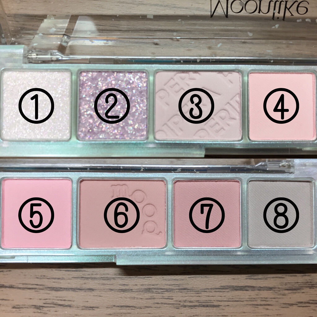 ミュートなローズやピンクベージュが多めの配色で、濃い締め色はない。締め色いらない人におすすめ。 左上の薄いマットカラーもちゃんと発色してくれる。下段はパレットの見た目よりも柔らかい色に発色するので、メインカラーとして使える。 ちょうどいい発色・柔らかい質感のマットカラー・色かわいい🤤・締め色もラメもあんまり使わないわたしにぴったり