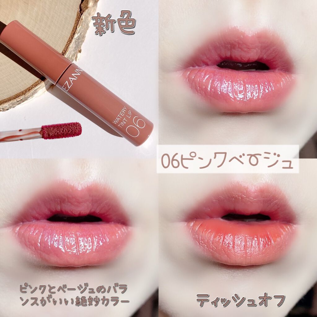 セザンヌ ウォータリーティントリップ ✔濡れたようなツヤ感が持続 ✔コップに色がつきにくいティント ✔美容保湿成分も配合 個人的に6番がツボ!✌️ 7色の中で一番好きかも・・絶妙なピンクベージュ そして今回の新色はさらにナチュラルで特に06は粘膜に近い可愛い色⭕️ 06番の次に私の好きなのは03のベージュブラウンかな・・🎀 06よりももう少し色がはっきりしてるブラウン系かな・・⭕️ ピンクやレッド、テラコッタと7色それぞれ絶妙に異なるカラーが揃っていてどれも使いやすいの✨ ブラシが柔らかめで良いしなり具合で、フチ取りもしやすいし、簡単にぷるんと仕上がる・・・⭕️ おすすめの塗り方はラフに塗って中央にたっぷり重ね塗り・・🤲 ティッシュオフしても血色感がしっかり残ってくれるよ・・・⭕️ 濡れツヤ感が可愛くて、持続性もあってこのお値段だもの・・(660円)✨🎉優秀すぎるね🤲
