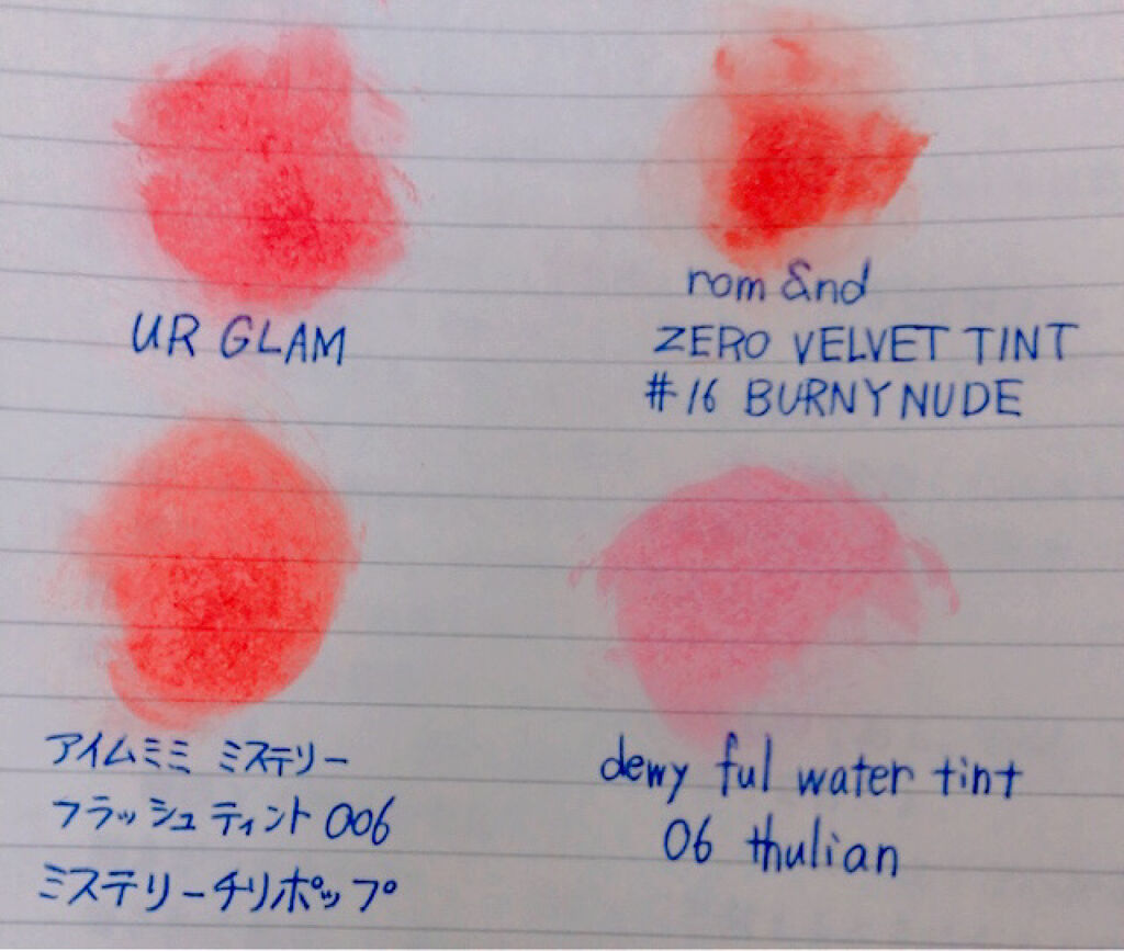 ロムアンド・URGLAM・アイムミミのリップティントの色や雰囲気、使い心地をレビューしてみました!私が持っている種類別代表的な4つを選抜して紹介して行きます💁♀️○rom&ndゼロベルベットティント #16BURNYNUDEマットタイプのオ...