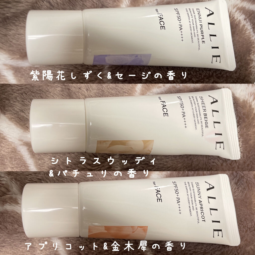 - 世界を想う 美しさつづく*1 日やけ止め おでかけも、マスクを外す機会も増える毎日に。 一部の国・地域・ビーチの規制に配慮した設計のビーチフレンドリー処方。 これ 1 本で、UV カット&顔色補整効果でクマ・くすみ・色ムラまでカバー! テカりにくく、くずれにくいノーファンデ UV*2 【ENNUI PURPLE】 くすみや毛穴をカバー 儚げな透明感のある顔印象続く 澄んだ気分を誘う 紫陽花しずく&セージの香り 【SUNNY APRICOT】 クマや毛穴をカバー いきいきとした血色感のある顔印象つづく 思わず出かけたくなる アプリコット&金木犀の香り 【SHERR BEIGE】 色ムラや毛穴をカバー 均一で抜け感のある顔印象つづく 自然で飾らない シトラスウッディ&パチュリの香り ●一部の国・地域・ビーチの規制に配慮した設計の「ビーチフレンドリー処方」 ●SPF50+・PA++++ ●汗・水 こすれに強く落ちにくい フリクションプルーフ・スーパーウォータープルーフ ●ベタつきにくい感触がつづく ●テカりにくくキレイな肌仕上がりがつづく ●環境に配慮した素材を使用したパッケージ採用 ●美容液成分(保湿)ヒアルロン酸Na配合 ●顔用 ●普段のメイククレンジングで落とせる ●マスク・タオル等につきにくい ●化粧下地効果 *1 スキンケア効果またはメイクアップ効果による肌仕上がりのこと *2 ファンデーション未使用時でも、自然なベースメイクが仕上がる日やけ止めのこと *3 チリ・ほこり・PM2.5・花粉等すべての微粒子汚れの付着を防ぐわけではありません 01:ENNUI PURPLE パープル 02:SUNNY APRICOT アプリコットピンク 03:SHEER BEIGE ミルキーベージュ