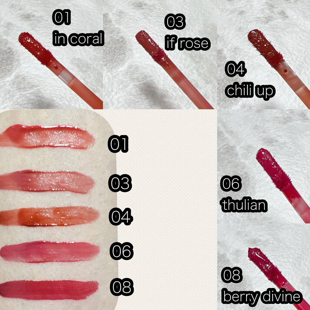 - <01 インコーラル> 水、ビスジグリセリルポリアシルアジペート-2、グリセリン、ジフェニルジメチコン、ジフェニルシロキシフェニルトリメチコン、ポリグリセリン-3、リンゴ酸ジイソステアリル、水添ポリイソブテン、ポリブテン、トリメチルシロキシフェニルジメチコン、変性アルコール、ポリソルベート60、イソノナン酸イソノニル、ペンチレングリコール、(アクリル酸ヒドロキシエチル/アクリロイルジメチルタウリンNa)コポ リマー、ラベンダーエキス、ハナハッカ花/葉/茎エキス、ローズマリーエキス、タイムエキス、ステアリン酸グリセリル、ステアリン酸PEG-100、スクワラン、ラウリルPEG-10トリス(トリメチルシロキシ)シリルエチルジメチコン、エチルヘキシルグリセリン、デキストリン、ステビオシド、イソステアリン酸ソルビタン、エチレンジアミンジコハク酸3Na、水酸化Al、ポリアクリル酸アンモニウム、BG、トコフェロール、フェノキシエタノール、香料、リモネン、酸化チタン、黄5、赤227、黄4、青1 <03 イフローズ> 水、ビスジグリセリルポリアシルアジペート-2、グリセリン、ジフェニルジメチコン、ジフェニルシロキシフェニルトリメチコン、ポリグリセリン-3、リンゴ酸ジイソステアリル、水添ポリイソブテン、ポリブテン、トリメチルシロキシフェニルジメチコン、変性アルコール、ポリソルベート60、イソノナン酸イソノニル、ペンチレングリコール、(アクリル酸ヒドロキシエチル/アクリロイルジメチルタウリンNa)コポリマー、ラベンダーエキス、ハナハッカ花/葉/茎エキス、ローズマリーエキス、タイムエキス、ステアリン酸グリセリル、ステアリン酸PEG-100、スクワラン、ラウリルPEG-10トリス(トリメチルシロキシ)シリルエチルジメチコン、エチルヘキシルグリセリン、デキストリン、ステビオシド、トリイソステアリン酸ポリグリセリル-2、イソステアリン酸ソルビタン、エチレンジアミンジコハク酸3Na、水酸化Al、ポリアクリル酸アンモニウム、BG、トコフェロール、フェノキシエタノール、香料、リモネン、酸化チタン、黄5、赤227、青1、黄4、赤218 <04 チリアップ> 水、ビスジグリセリルポリアシルアジペート-2、グリセリン、ジフェニルジメチコン、ジフェニルシロキシフェニルトリメチコン、ポリグリセリン-3、リンゴ酸ジイソステアリル、水添ポリイソブテン、ポリブテン、トリメチルシロキシフェニルジメチコン、変性アルコール、ポリソルベート60、イソノナン酸イソノニル、ペンチレングリコール、(アクリル酸ヒドロキシエチル/アクリロイルジメチルタウリンNa)コポ リマー、ラベンダーエキス、ハナハッカ花/葉/茎エキス、ローズマリーエキス、タイムエキス、ステアリン酸グリセリル、ステアリン酸PEG-100、スクワラン、ラウリルPEG-10トリス(トリメチルシロキシ)シリルエチルジメチコン、エチルヘキシルグリセリン、デキストリン、ステビオシド、イソステアリン酸ソルビタン、エチレンジアミンジコハク酸3Na、トコフェロール、BG、フェノキシエタノール、料、リモネン、黄5、赤227、黄4、青1 <06 チュリアン> 水、ビスジグリセリルポリアシルアジペート-2、グリセリン、ジフェニルジメチコン、ジフェニルシロキシフェニルトリメチコン、ポリグリセリン-3、リンゴ酸ジイソステアリル、水添ポリイソブテン、ポリブテン、トリメチルシロキシフェニルジメチコン、変性アルコール、ポリソルベート60、イソノナン酸イソノニル、ペンチレングリコール、(アクリル酸ヒドロキシエチル/アクリロイルジメチルタウリンNa)コポリマー、ラベンダーエキス、ハナハッカ花/葉/茎エキス、ローズマリーエキス、タイムエキス、ステアリン酸グリセリル、ステアリン酸PEG-100、スクワラン、ラウリルPEG-10トリス(トリメチルシロキシ)シリルエチルジメチコン、エチルヘキシルグリセリン、デキストリン、ステビオシド、イソステアリン酸ソルビタン、エチレンジアミンジコハク酸3Na、水酸化Al、ポリアクリル酸アンモニウム、BG、トコフェロール、フェノキシエタノール、香料、リモネン、酸化チタン、黄5、赤227、酸化鉄、黄4、赤218、青1 <08 ベリーディヴァイン> 水、ビスジグリセリルポリアシルアジペート-2、グリセリン、ジフェニルジメチコン、ジフェニルシロキシフェニルトリメチコン、ポリグリセリン-3、リンゴ酸ジイソステアリル、水添ポリイソブテン、ポリブテン、トリメチルシロキシフェニルジメチコン、変性アルコール、ポリソルベート60、イソノナン酸イソノニル、ペンチレングリコール、(アクリル酸ヒドロキシエチル/アクリロイルジメチルタウリンNa)コポリマー、ラベンダーエキス、ハナハッカ花/葉/茎エキス、ローズマリーエキス、タイムエキス、ステアリン酸グリセリル、ステアリン酸PEG-100、スクワラン、ラウリルPEG-10トリス(トリメチルシロキシ)シリルエチルジメチコン、エチルヘキシルグリセリン、イソステアリン酸ソルビタン、デキストリン、ステビオシド、エチレンジアミン