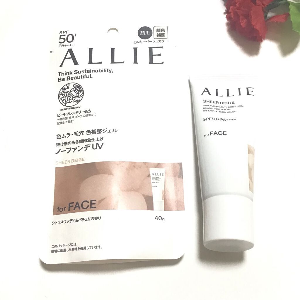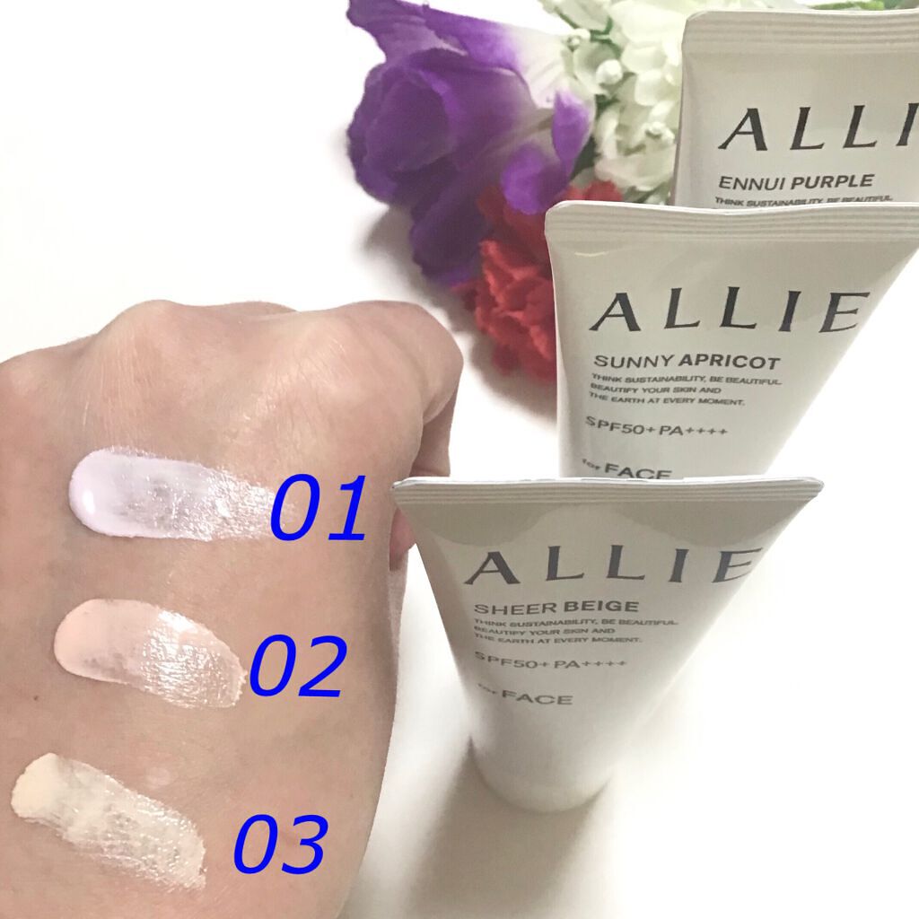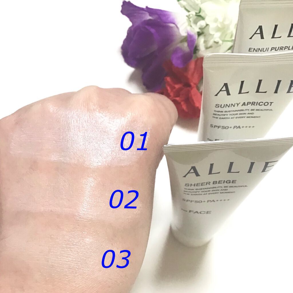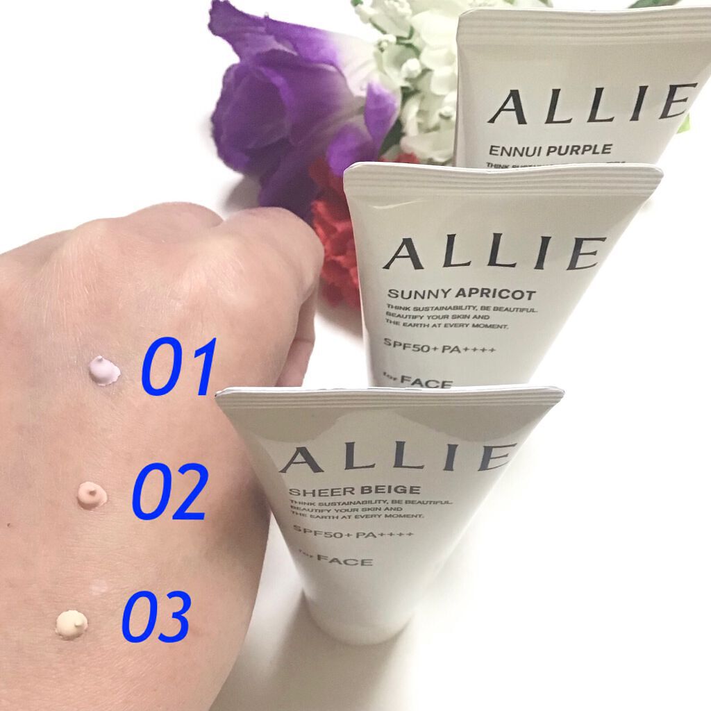 - 世界を想う 美しさつづく*1 日やけ止め おでかけも、マスクを外す機会も増える毎日に。 一部の国・地域・ビーチの規制に配慮した設計のビーチフレンドリー処方。 これ 1 本で、UV カット&顔色補整効果でクマ・くすみ・色ムラまでカバー! テカりにくく、くずれにくいノーファンデ UV*2 【ENNUI PURPLE】 くすみや毛穴をカバー 儚げな透明感のある顔印象続く 澄んだ気分を誘う 紫陽花しずく&セージの香り 【SUNNY APRICOT】 クマや毛穴をカバー いきいきとした血色感のある顔印象つづく 思わず出かけたくなる アプリコット&金木犀の香り 【SHERR BEIGE】 色ムラや毛穴をカバー 均一で抜け感のある顔印象つづく 自然で飾らない シトラスウッディ&パチュリの香り ●一部の国・地域・ビーチの規制に配慮した設計の「ビーチフレンドリー処方」 ●SPF50+・PA++++ ●汗・水 こすれに強く落ちにくい フリクションプルーフ・スーパーウォータープルーフ ●ベタつきにくい感触がつづく ●テカりにくくキレイな肌仕上がりがつづく ●環境に配慮した素材を使用したパッケージ採用 ●美容液成分(保湿)ヒアルロン酸Na配合 ●顔用 ●普段のメイククレンジングで落とせる ●マスク・タオル等につきにくい ●化粧下地効果 *1 スキンケア効果またはメイクアップ効果による肌仕上がりのこと *2 ファンデーション未使用時でも、自然なベースメイクが仕上がる日やけ止めのこと *3 チリ・ほこり・PM2.5・花粉等すべての微粒子汚れの付着を防ぐわけではありません 01:ENNUI PURPLE パープル 02:SUNNY APRICOT アプリコットピンク 03:SHEER BEIGE ミルキーベージュ