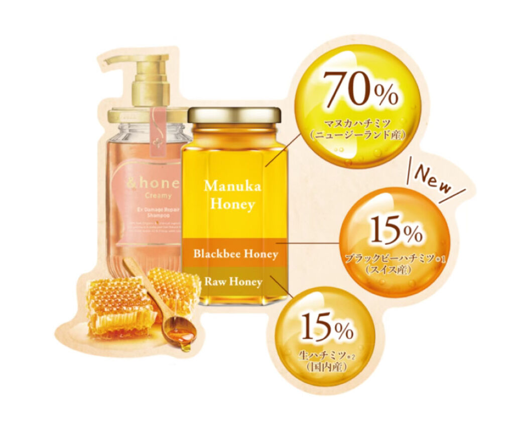 - <シャンプー 増量 385ml> 水、ラウラミドプロピルベタイン、オレフィン(C14-16)スルホン酸Na、ココイルメチルタウリンNa、グリセリン、コカミドメチルMEA、ラウロイルメチルアラニンNa、ハチミツ、ハチミツエキス、加水分解ハチミツタンパク、アルガニアスピノサ核油、シア脂グリセレス-8エステルズ、加水分解コラーゲンPGプロピルメチルシランジオール、ケラチン(羊毛)、リンゴ酸ジイソステアリル、ポリクオタニウム-61、ローヤルゼリーエキス、プロポリスエキス、セレブロシド、ローヤルゼリー、カルボキシメチルヒアルロン酸Na、ザイモモナス培養エキス、ヨーロッパキイチゴ種子油、ポリクオタニウム-47、PPG-7、EDTA-2Na、ヤシ油アルキルグルコシド、ポリクオタニウム-10、塩化Na、キサンタンガム、メントール、水酸化K、メトキシケイヒ酸エチルヘキシル、ジエチルアミノヒドロキシベンゾイル安息香酸ヘキシル、エタノール、安息香酸Na、黄4、赤227、紫401、クエン酸、BG、フェノキシエタノール、香料 <シャンプー本体450ml> 水、ラウラミドプロピルベタイン、オレフィン(C14-16)スルホン酸Na、ココイルメチルタウリンNa、グリセリン、コカミドメチルMEA、ラウロイルメチルアラニンNa、ハチミツ、ハチミツエキス、加水分解ハチミツタンパク、アルガニアスピノサ核油、シア脂グリセレス-8エステルズ、加水分解コラーゲンPGプロピルメチルシランジオール、ケラチン(羊毛)、リンゴ酸ジイソステアリル、ポリクオタニウム-61、ローヤルゼリーエキス、プロポリスエキス、セレブロシド、ローヤルゼリー、カルボキシメチルヒアルロン酸Na、ザイモモナス培養エキス、ヨーロッパキイチゴ種子油、ポリクオタニウム-47、PPG-7、EDTA-2Na、ヤシ油アルキルグルコシド、ポリクオタニウム-10、塩化Na、キサンタンガム、メントール、水酸化K、メトキシケイヒ酸エチルヘキシル、ジエチルアミノヒドロキシベンゾイル安息香酸ヘキシル、エタノール、安息香酸Na、黄4、赤227、紫401、クエン酸、BG、フェノキシエタノール、香料 <ヘアトリートメント本体450g> 水、セタノール、ベヘントリモニウムクロリド、ステアリルアルコール、グリセリン、アモジメチコン、トリエチルヘキサノイン、ハチミツ、ハチミツエキス、加水分解ハチミツタンパク、アルガニアスピノサ核油、加水分解コラーゲンPGプロピルメチルシランジオール、ケラチン(羊毛)、リンゴ酸ジイソステアリル、ポリクオタニウム-61、ローヤルゼリー、ローヤルゼリーエキス、プロポリスエキス、セレブロシド、カルボキシメチルヒアルロン酸Na、ザイモモナス培養エキス、クロフサスグリ種子油、ヒマワリ種子油、ローズマリー葉エキス、フウセンカズラ花/葉/つるエキス、ヒマワリ種子油不けん化物、キサンタンガム、ヒドロキシエチルセルロース、メトキシケイヒ酸エチルヘキシル、ジエチルアミノヒドロキシベンゾイル安息香酸ヘキシル、クエン酸、クエン酸Na、トコフェロール、オクチルドデカノール、ヤシ油アルキルグルコシド、アミノプロピルジメチコン、ジメチコン、カラメル、イソプロパノール、エタノール、BG、フェノキシエタノール、香料 <シャンプー(詰替)350ml> 水、ラウラミドプロピルベタイン、オレフィン(C14-16)スルホン酸Na、ココイルメチルタウリンNa、グリセリン、コカミドメチルMEA、ラウロイルメチルアラニンNa、ハチミツ、ハチミツエキス、加水分解ハチミツタンパク、アルガニアスピノサ核油、シア脂グリセレス-8エステルズ、加水分解コラーゲンPGプロピルメチルシランジオール、ケラチン(羊毛)、リンゴ酸ジイソステアリル、ポリクオタニウム-61、ローヤルゼリーエキス、プロポリスエキス、セレブロシド、ローヤルゼリー、カルボキシメチルヒアルロン酸Na、ザイモモナス培養エキス、ヨーロッパキイチゴ種子油、ポリクオタニウム-47、PPG-7、EDTA-2Na、ヤシ油アルキルグルコシド、ポリクオタニウム-10、塩化Na、キサンタンガム、メントール、水酸化K、メトキシケイヒ酸エチルヘキシル、ジエチルアミノヒドロキシベンゾイル安息香酸ヘキシル、エタノール、安息香酸Na、黄4、赤227、紫401、クエン酸、BG、フェノキシエタノール、香料 <ヘアトリートメント(詰替)350g> 水、セタノール、ベヘントリモニウムクロリド、ステアリルアルコール、グリセリン、アモジメチコン、トリエチルヘキサノイン、ハチミツ、ハチミツエキス、加水分解ハチミツタンパク、アルガニアスピノサ核油、加水分解コラーゲンPGプロピルメチルシランジオール、ケラチン(羊毛)、リンゴ酸ジイソステアリル、ポリクオタニウム-61、ローヤルゼリー、ローヤルゼリーエキス、プロポリスエキス、セレブロシド、カルボキシメチルヒアルロン酸Na、ザイモモナス培養エキス、クロフサスグリ種子油、ヒマワリ種子油、ローズマリー葉エキス、フウセンカズラ花/葉/つるエキス、ヒマワリ種子油不けん化物、キサンタンガム、ヒドロキシエチルセルロース、メトキシケイヒ酸エチルヘキシル
