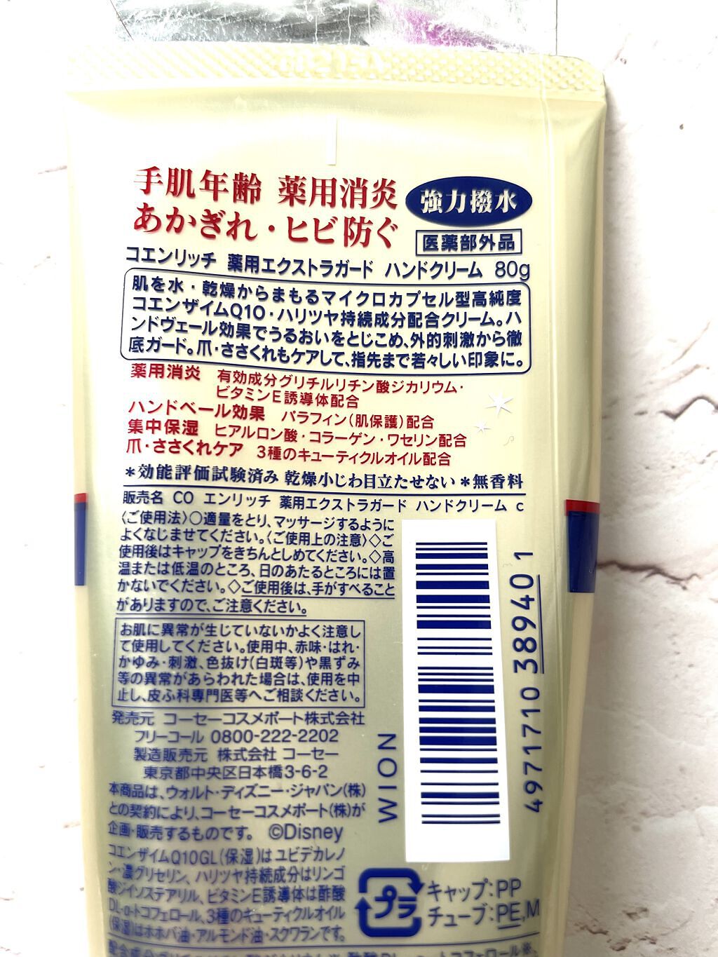 - <80g> 水、BG、グリセリン、トリエチルヘキサノイン、セテアリルアルコール、DPG、ベヘニルアルコール、ワセリン、ミネラルオイル、水添ナタネ油脂肪酸グリセリズ、アーモンド油、グリコシルトレハロース、トコフェロール、パンテノール、ヒアルロン酸Na、ホホバ種子油、メドウフォーム油、ユビキノン、加水分解コラーゲン、EDTA-2Na、(アクリレーツ/アクリル酸アルキル(C10-30))クロスポリマー、カラギーナン、カンテン、キサンタンガム、ジメチコン、スクワラン、ステアロイルメチルタウリンNa、パルミチン酸ソルビタン、ヘキサ(ヒドロキシステアリン酸/ステアリン酸/ロジン酸)ジペンタエリスリチル、ポリソルベート80、リンゴ酸ジイソステアリル、加水分解水添デンプン、水酸化Na、フェノキシエタノール、メチルパラベン、香料、カラメル、酸化鉄 <Disney限定デザイン(80g)> 水、BG、グリセリン、トリエチルヘキサノイン、セテアリルアルコール、DPG、ベヘニルアルコール、ワセリン、ミネラルオイル、水添ナタネ油脂肪酸グリセリズ、アーモンド油、グリコシルトレハロース、トコフェロール、パンテノール、ヒアルロン酸Na、ホホバ種子油、メドウフォーム油、ユビキノン、加水分解コラーゲン、EDTA-2Na、(アクリレーツ/アクリル酸アルキル(C10-30))クロスポリマー、カラギーナン、カンテン、キサンタンガム、ジメチコン、スクワラン、ステアロイルメチルタウリンNa、パルミチン酸ソルビタン、ヘキサ(ヒドロキシステアリン酸/ステアリン酸/ロジン酸)ジペンタエリスリチル、ポリソルベート80、リンゴ酸ジイソステアリル、加水分解水添デンプン、水酸化Na、フェノキシエタノール、メチルパラベン、香料、カラメル、酸化鉄