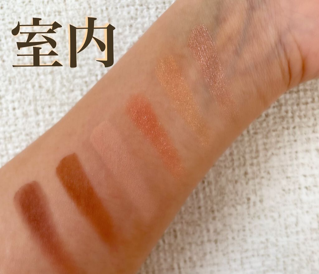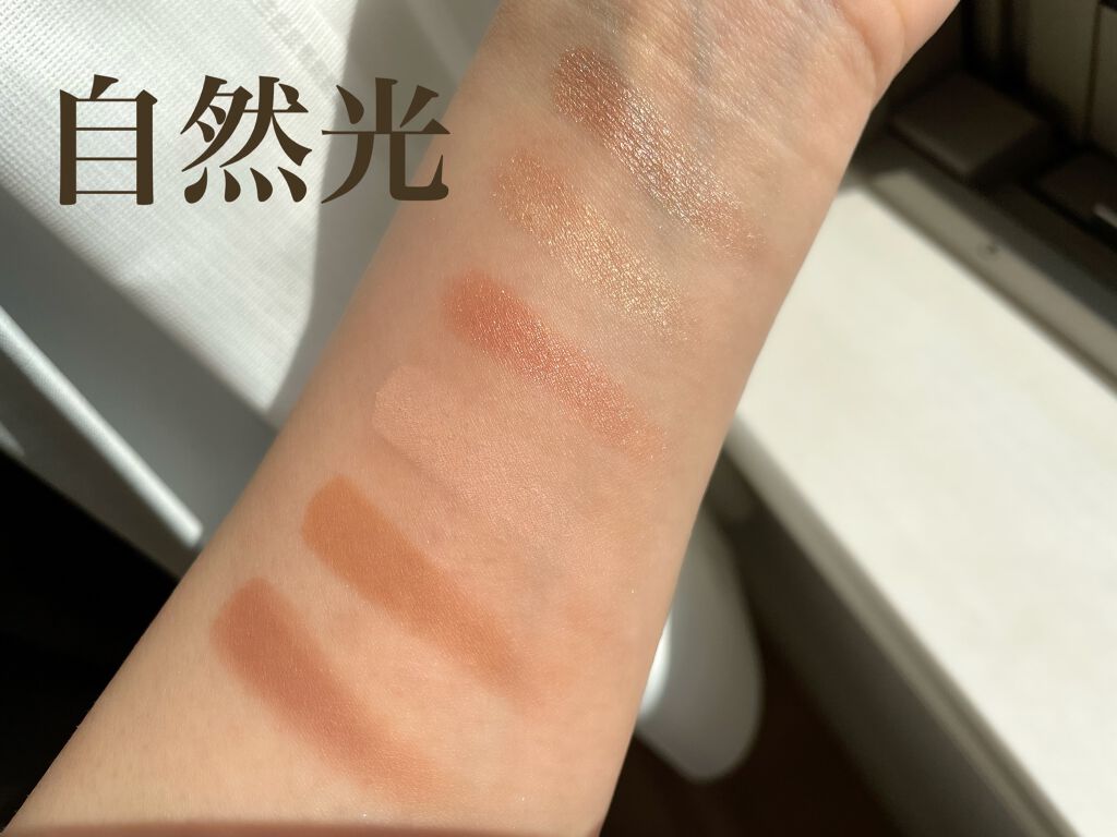 こちらは今回定番色に追加されたお色になっています。 左上のラメがベージュがかっていて使いやすく、オレンジのカラーの発色がとにかく良いです。 ブルーグリーンのカラーをどう使おうかが悩みどころでしたが、ライン代わりに使用することで一気にお洒落な目元に仕上がりました🐣 ラメ落ちもなく、しっとりとした質感で使いやすかったです。