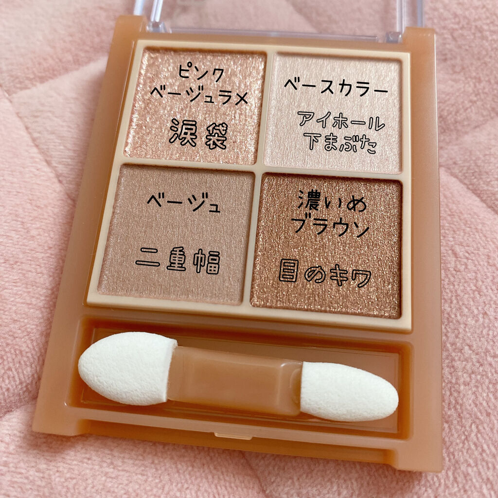 - ラメ・パール・マット3質感の4色アイシャドウ。 肌馴染みの良いベージュを基調としたカラー。ラメ・パール・マットの3質感を重ねて、自然にまぶたを強調し奥行のある大きな目元へ。 しっとり溶け込むような柔らかなパウダーなので、スルスル伸びてまぶたにピタッと密着。保湿成分(スクワラン・ホホバ種子油)配合。