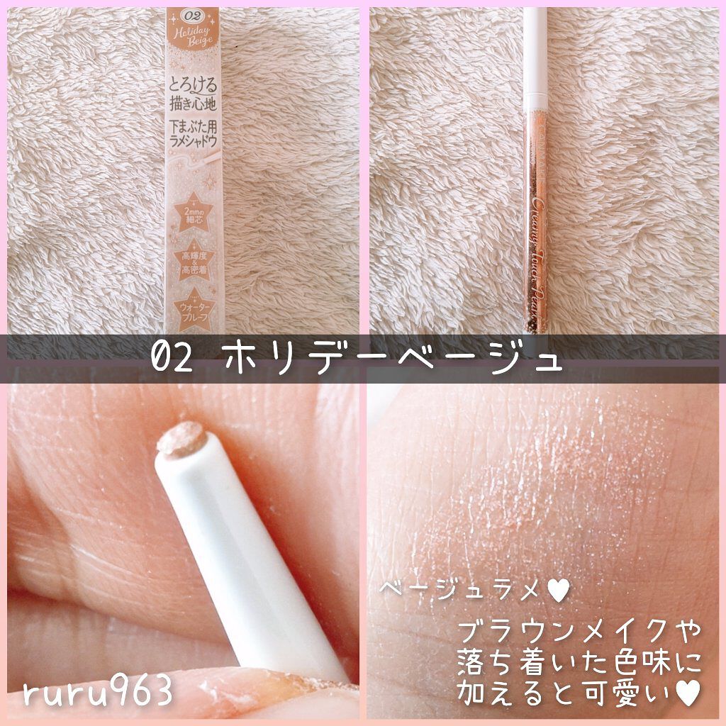 - とろける描き心地の極細ラメシャドウが限定新登場★ 下まぶたメイクを楽しむ✨ ピンポイントでラメラインを入れられる極細ラメシャドウ! 2mmの細芯で小回りが利くので細いラインが簡単に描ける♪ 柔らか芯なので、肌当たりはとても優しく、アイシャドウチップでのせるよりも手軽にラメラインが描けるアイテムです! 1度描きでしっかりキラキラする高輝度ラメで、重ね描きは不要* 1度乾いて密着すればとにかく落ちにくい✨水・汗・涙に強いウォータープルーフ処方!描きたての仕上がりを長時間キープ★