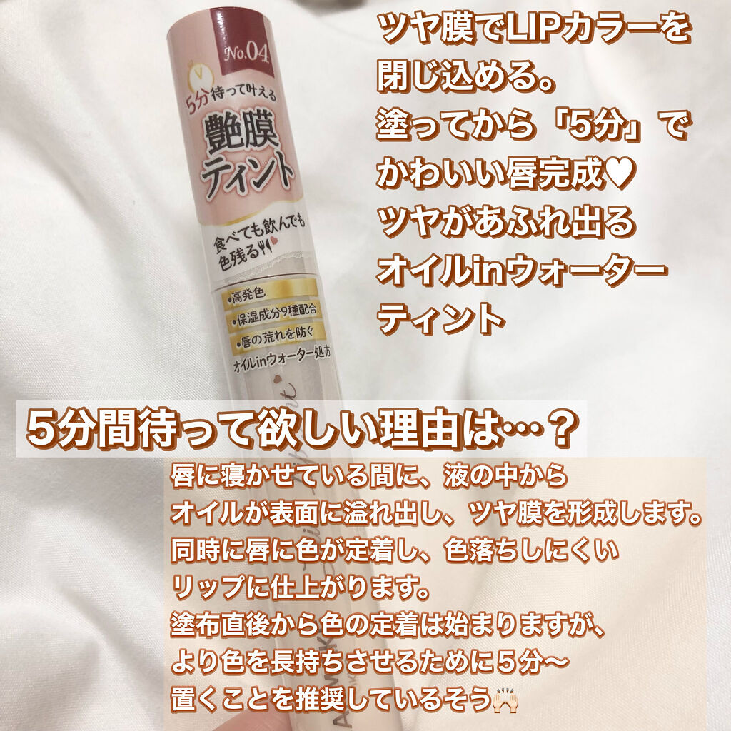 - ツヤ膜でLIPカラーを閉じ込める 塗ってから「5分」でかわいい唇完成♥ツヤがあふれ出るオイルinウォーターティント 水に対して約2倍のオイル成分を配合した「オイルinウォーター処方」 時間経過でツヤ膜がじゅわ~っとあふれ出し、 まるでグロスを重ねたような仕上がりに。みずみずしいツヤ感が持続します。 塗布後、時間経過(※)で色が定着して食べても飲んでも血色長持ち。 (※定着には個人差があります。弊社5分推奨) 高密着で唇に溶け込むように色づきます。 コップやペットボトルへの色移りがしにくくなります。
