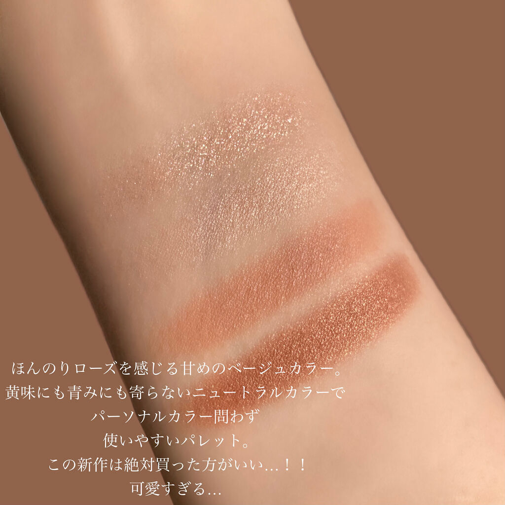 - ラメ・パール・マット3質感の4色アイシャドウ。 肌馴染みの良いベージュを基調としたカラー。ラメ・パール・マットの3質感を重ねて、自然にまぶたを強調し奥行のある大きな目元へ。 しっとり溶け込むような柔らかなパウダーなので、スルスル伸びてまぶたにピタッと密着。保湿成分(スクワラン・ホホバ種子油)配合。