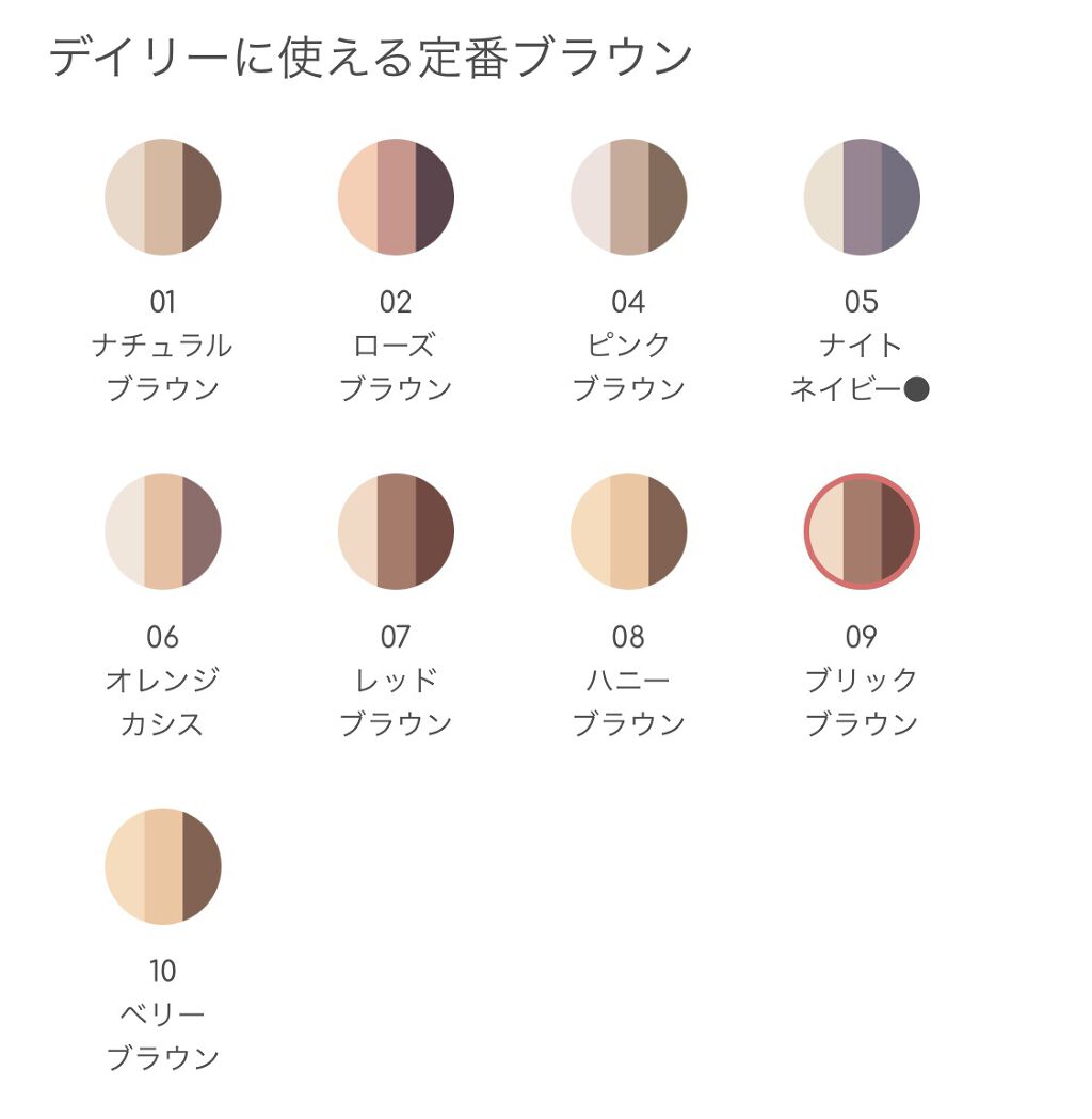 - 3色で簡単に明るく大きな目元に。 しっとり感触のアイシャドウ。 くすみを飛ばす明るさベース、ひとえ・奥二重の方でも幅広く塗れる肌なじみの良い中間色、 濃密高発色の締め色が目の輪郭を強調し大きな目元に。 微細パール配合でくすみを飛ばし、明るい目元へ。