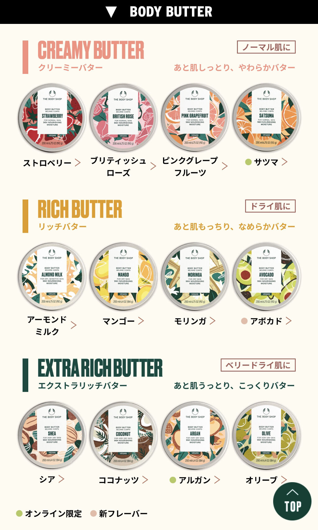 - 1. 極上のうるおい ほとんどのボディバターに配合されている天然保湿成分の「シアバター」。 アフリカで古くから「生命の木」と呼ばれ、何世紀もの間サハラ砂漠の熱風から女性たちの肌を守ってきました。 高い保湿力で肌をうるおいで包み込み、ふっくらなめらかに整えます。 2.お好みで選べる香りとうるおい 華やかなお花の香りからジューシィなフルーツの香りまで、気分やお好みに合わせてお選びいただける豊富なラインナップ。 また「ノーマル」「ノーマル~ドライ」「ドライ」「ベリードライ」と、肌の状態に合わせてチョイスできます。 3.コミュニティを豊かにするフェアトレード原料 ザボディショップのボディバターには、シアバターやババスオイルなど世界各地のパートナーからコミュニティトレード(独自のフェアトレードプログラム)で調達した天然原料を配合しています。 ボディバターの贅沢なうるおいは、私たちの肌だけではなく、コミュニティトレードパートナーの人々の生活も豊かにうるおします。
