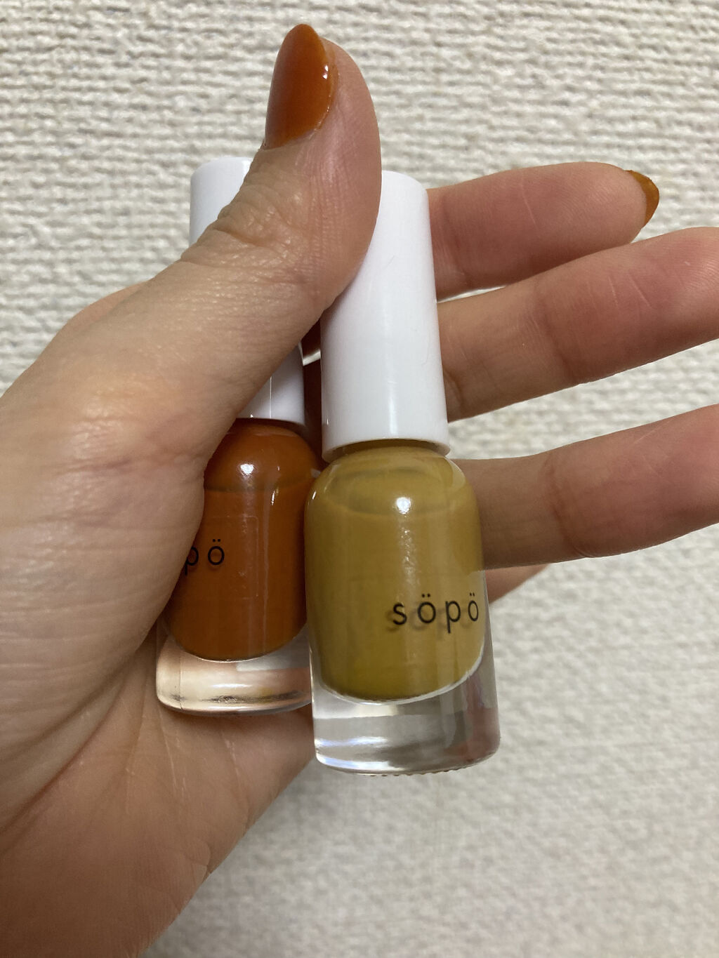 ファミマのネイルsopoサンセットオレンジ<限定色>三日月イエロー<限定色>見てて元気が出るカラーに惹かれて購入目立たないところに置いてあって限定色みたいだけど、まだ複数ありました2度塗りです。高発色✨サンセットオレンジがとにかくかわいい...