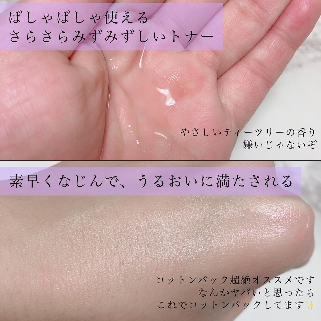 ティーツリーやツボクサ成分(CICA)が配合されているトナー.′.′ ピンク色でふんわりお花みたいなかわいらしい香りです🌷˒˒* このピンク色は自然成分[ビタミンB12]の本来の色で、ビタミンB12は荒れた肌に水分と活力を与え肌環境を整えてくれるんだって✨✨ セラミドNPやアラントインなどの成分が入っていて、保湿と肌荒れ予防を同時にケアしたい人に◎