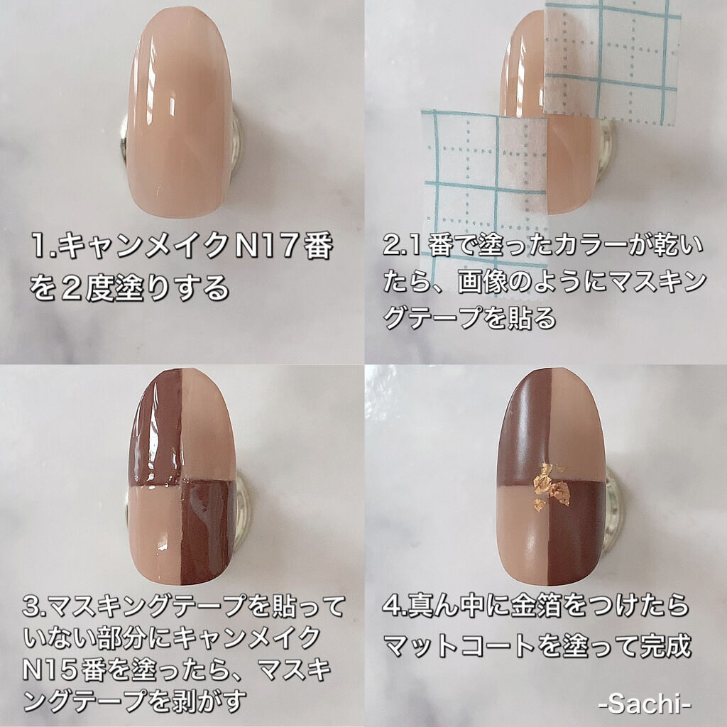 ワンカラーでも指ごとに色を変えるだけでオシャレに見えます💕 画像のようにゴールドラインとストーンを少し足すだけで華やかさがアップ🥰 何度かご紹介したことのあるスポンジで作るグラデーションです✨ スポンジを使うことで境目が綺麗に馴染んでくれます💕 アルミホイルの上でブラウンとトップコートを1:1くらいで混ぜたものを、トップコートのハケに取って3箇所に塗るだけ👌 事前に混ぜたものを塗ることで、爪の上でぼかすより簡単に出来ます💕 ベースカラーが乾く前に点置きしてぼかすことで綺麗にぼかせます✨ スピードが大事なので、使うポリッシュのキャップは全て開けておきましょう😊 天然石のラインはガタガタの方がより天然石っぽく見えるので、ラインを描くのが苦手な方でも大丈夫🙆♀️ 難しそうに見えて、やってみると意外と簡単に出来ます♡