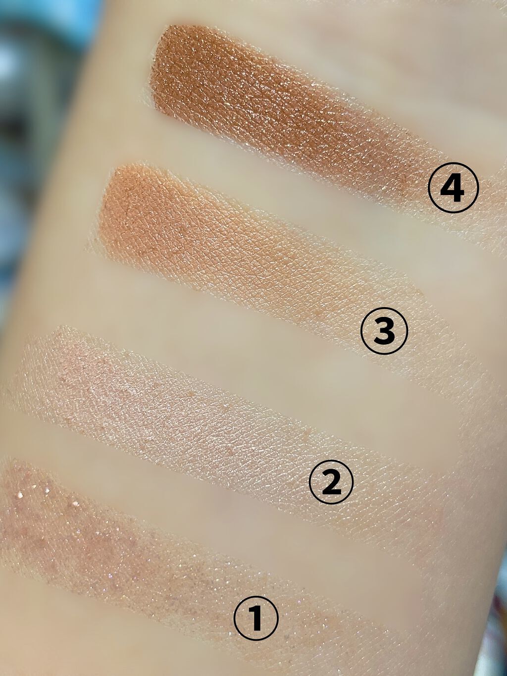 - ラメ・パール・マット3質感の4色アイシャドウ。 肌馴染みの良いベージュを基調としたカラー。ラメ・パール・マットの3質感を重ねて、自然にまぶたを強調し奥行のある大きな目元へ。 しっとり溶け込むような柔らかなパウダーなので、スルスル伸びてまぶたにピタッと密着。保湿成分(スクワラン・ホホバ種子油)配合。