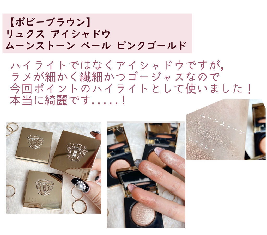 リンメルの005フロスティローズ、ボビーブラウンの04ゴールデンピンクは共に肌なじみのいいピンクゴールドカラー💫 ボビーブラウンの方がメタリック感が強いので涙袋全体に塗ってしまうとギラギラして見えてしまいます😭 個人的に3500円の違いは塗りやすさとデパコスならではのゴージャスなメタリック感かなと思いました…!