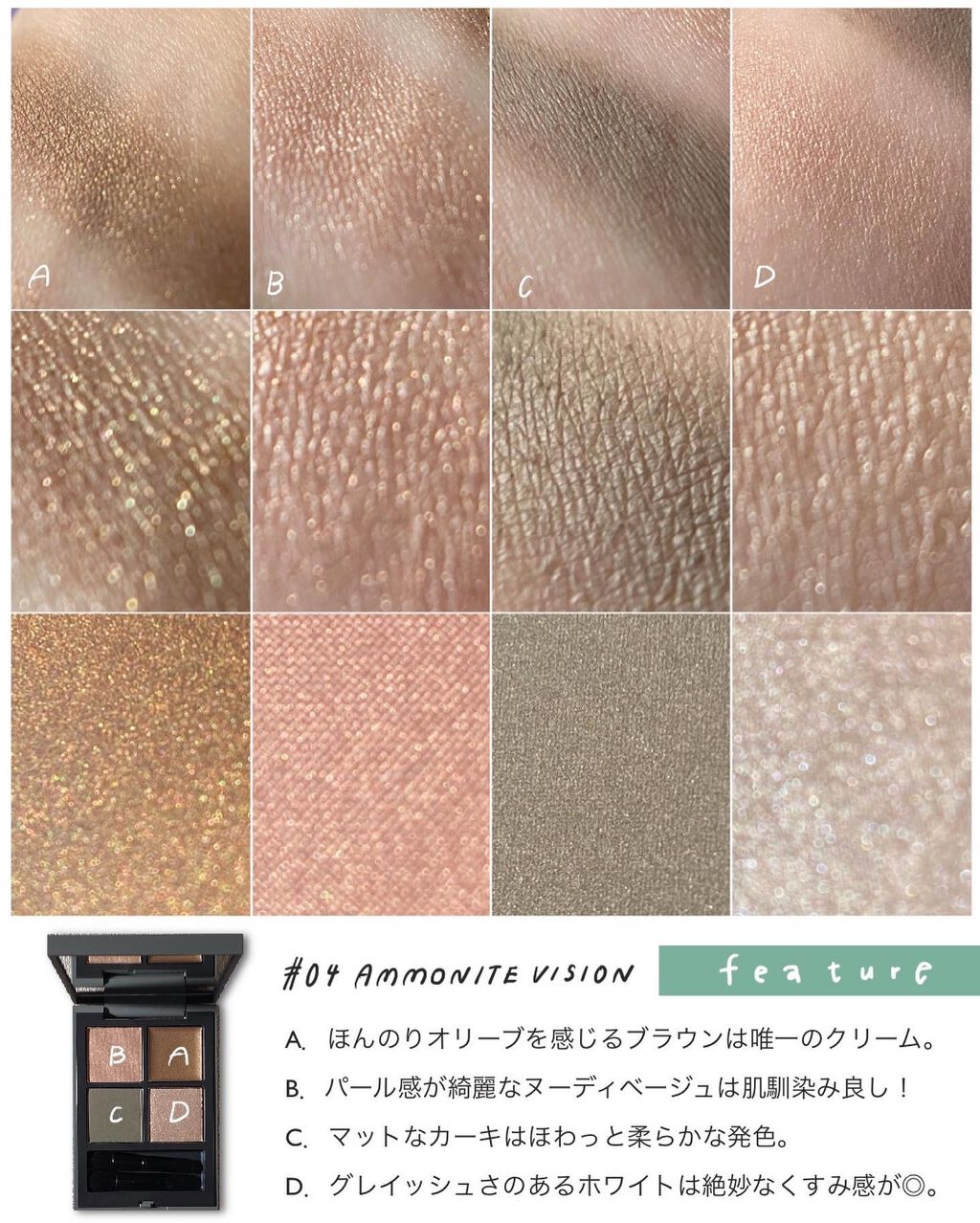アンプリのベーシック系のカラーの中でもひときわニュートラルな、色味を削いだようなベージュブラウン。 こちらも少し前(7/30)にレビューしているのでそちらもご参考いただけたら🙇♀️ このパレットはベーシックでありながらトレンド感もあるところがお気に入りポイントでして、ちょっとセピアを帯びたようなくすみ感がなんとも言えずお洒落な雰囲気を醸し出してくれます。 というのは全体的に肌に馴染むようなヌーディカラーで構成されたすごくナチュラルなシェードなんだけど、シルバー系のパールが潜んでいたり、少しくすみ感があったりと、甘さを取り除いてクールな仕上がりになるところがめちゃくちゃかっこいいのよ。 ダイヤモンドを彷彿とさせるような大粒のラメの煌めきがたまらなく美しいアイカラーです。 このパレットの好きなところは、マットが主役なところ。絶妙にニュアンスの異なる3色のマットでグラデーションしやすいのがミソです。 パールカラーの入れ方次第で表情が変わるパレットだと思う。