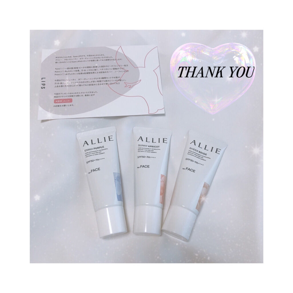 - 世界を想う 美しさつづく*1 日やけ止め おでかけも、マスクを外す機会も増える毎日に。 一部の国・地域・ビーチの規制に配慮した設計のビーチフレンドリー処方。 これ 1 本で、UV カット&顔色補整効果でクマ・くすみ・色ムラまでカバー! テカりにくく、くずれにくいノーファンデ UV*2 【ENNUI PURPLE】 くすみや毛穴をカバー 儚げな透明感のある顔印象続く 澄んだ気分を誘う 紫陽花しずく&セージの香り 【SUNNY APRICOT】 クマや毛穴をカバー いきいきとした血色感のある顔印象つづく 思わず出かけたくなる アプリコット&金木犀の香り 【SHERR BEIGE】 色ムラや毛穴をカバー 均一で抜け感のある顔印象つづく 自然で飾らない シトラスウッディ&パチュリの香り ●一部の国・地域・ビーチの規制に配慮した設計の「ビーチフレンドリー処方」 ●SPF50+・PA++++ ●汗・水 こすれに強く落ちにくい フリクションプルーフ・スーパーウォータープルーフ ●ベタつきにくい感触がつづく ●テカりにくくキレイな肌仕上がりがつづく ●環境に配慮した素材を使用したパッケージ採用 ●美容液成分(保湿)ヒアルロン酸Na配合 ●顔用 ●普段のメイククレンジングで落とせる ●マスク・タオル等につきにくい ●化粧下地効果 *1 スキンケア効果またはメイクアップ効果による肌仕上がりのこと *2 ファンデーション未使用時でも、自然なベースメイクが仕上がる日やけ止めのこと *3 チリ・ほこり・PM2.5・花粉等すべての微粒子汚れの付着を防ぐわけではありません 01:ENNUI PURPLE パープル 02:SUNNY APRICOT アプリコットピンク 03:SHEER BEIGE ミルキーベージュ
