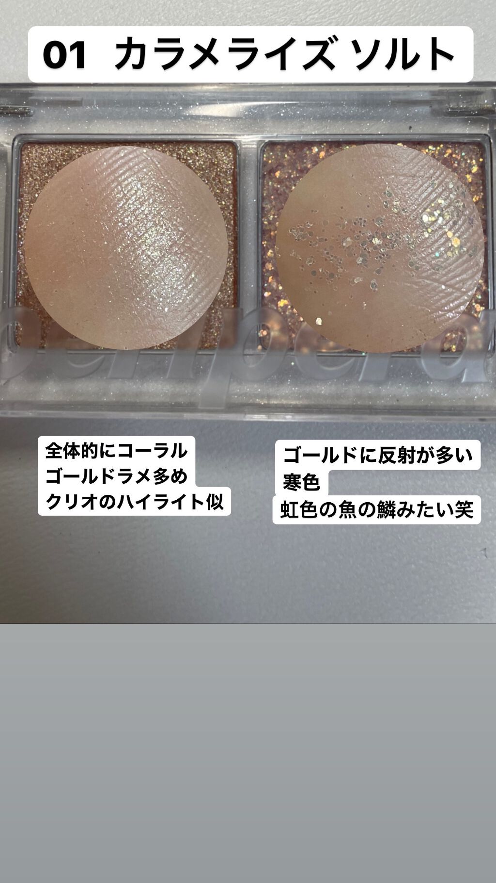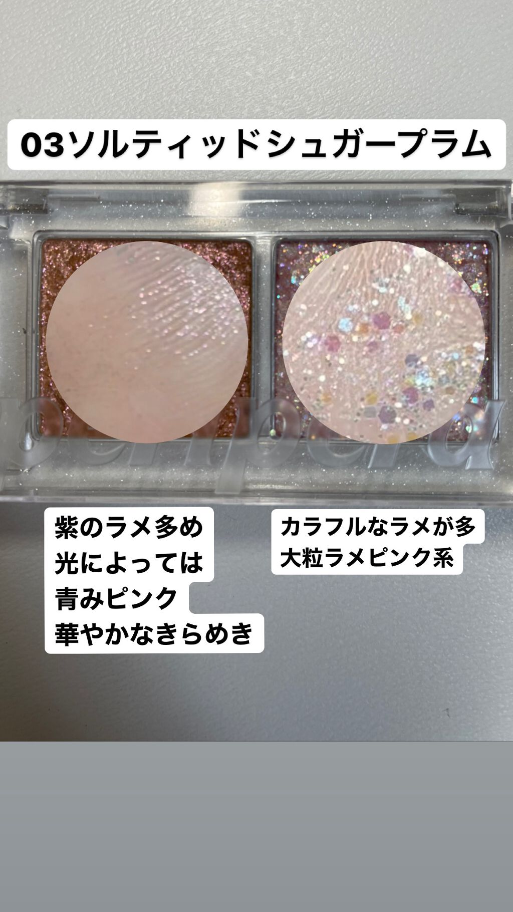 ベース色も繊細で可愛いし 締め色のピンクが最強に可愛い。 大粒ラメは涙袋にぴったりで最強に盛れる✨ アイシャドウ迷走中の人には是非試してほしい! アイシャドウどうしようって思ったらすぐ、これ使うくらいすきだし使いやすい! やすいし、小さいし、持ち運びにピッタリ!! でも、若干粉飛びするからアイシャドウベースがあるといいかも!