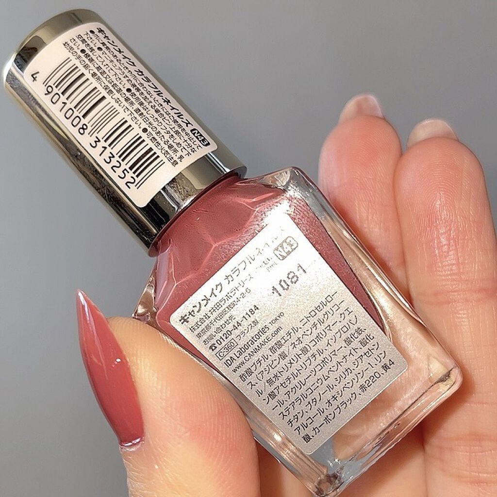 - <N02 シックボルドー> 酢酸ブチル、酢酸エチル、ニトロセルロース、(アジピン酸/ネオペンチルグリコール/無水トリメリト酸)コポリマー、クエン酸アセチルトリブチル、イソプロパノール、アクリレーツコポリマー、ステアラルコニウムベントナイト、酸化鉄、ブタノール、オキシベンゾン-1、シリカ、赤220、ジアセトンアルコール、酸化チタン、リン酸、カーボンブラック、ジ安息香酸トリメチルペンタンジイル、黄4、赤226 [旧]酢酸ブチル、酢酸エチル、ニトロセルロース、(アジピン酸/ネオペンチルグリコール/無水トリメリト酸)コポリマー、クエン酸アセチルトリブチル、イソプロパノール、アクリレーツコポリマー、ステアラルコニウムベントナイト、(スチレン/アクリレーツ)コポリマー、酸化鉄、ブタノール、シリカ、オキシベンゾン-1、赤220、ジアセトンアルコール、酸化チタン、ジ安息香酸トリメチルペンタンジイル、リン酸、カーボンブラック、黄4 <N08 ミスティモーヴ> 酢酸ブチル、酢酸エチル、ニトロセルロース、(アジピン酸/ネオペンチルグリコール/無水トリメリト酸)コポリマー、クエン酸アセチルトリブチル、イソプロパノール、アクリレーツコポリマー、ステアラルコニウムベントナイト、酸化チタン、ブタノール、シリカ、オキシベンゾン-1、マンガンバイオレット、ジアセトンアルコール、酸化鉄、赤226、リン酸、カオリン、ジ安息香酸トリメチルペンタンジイル、黄4 [旧] 酢酸ブチル、酢酸エチル、ニトロセルロース、(アジピン酸/ネオペンチルグリコール/無水トリメリト酸)コポリマー、クエン酸アセチルトリブチル、イソプロパノール、アクリレーツコポリマー、ステアラルコニウムベントナイト、(スチレン/アクリレーツ)コポリマー、酸化チタン、ブタノール、オキシベンゾン-1、シリカ、酸化鉄、ジアセトンアルコール、マンガンバイオレット、ジ安息香酸トリメチルペンタンジイル、リン酸、カーボンブラック、黄4 <N10 ペールラベンダー> 酢酸ブチル、酢酸エチル、ニトロセルロース、(アジピン酸/ネオペンチルグリコール/無水トリメリト酸)コポリマー、クエン酸アセチルトリブチル、イソプロパノール、アクリレーツコポリマー、ステアラルコニウムベントナイト、酸化チタン、ブタノール、酸化鉄、オキシベンゾン-1、シリカ、ジアセトンアルコール、マンガンバイオレット、リン酸、ジ安息香酸トリメチルペンタンジイル、黄4、赤226 [旧]酢酸ブチル、酢酸エチル、ニトロセルロース、(アジピン酸/ネオペンチルグリコール/無水トリメリト酸)コポリマー、クエン酸アセチルトリブチル、イソプロパノール、アクリレーツコポリマー、ステアラルコニウムベントナイト、酸化チタン、ブタノール、シリカ、オキシベンゾン-1、ジアセトンアルコール、酸化鉄、ジ安息香酸トリメチルペンタンジイル、マンガンバイオレット、リン酸、黄4 <N12 アーモンドグリーン> 酢酸ブチル、酢酸エチル、ニトロセルロース、(アジピン酸/ネオペンチルグリコール/無水トリメリト酸)コポリマー、クエン酸アセチルトリブチル、イソプロパノール、アクリレーツコポリマー、ステアラルコニウムベントナイト、(スチレン/アクリレーツ)コポリマー、酸化チタン、ブタノール、シリカ、オキシベンゾン-1、ジアセトンアルコール、ジ安息香酸トリメチルペンタンジイル、黄4、カーボンブラック、リン酸、コンジョウ <N16 ココア> 酢酸ブチル、酢酸エチル、ニトロセルロース、(アジピン酸/ネオペンチルグリコール/無水トリメリト酸)コポリマー、クエン酸アセチルトリブチル、イソプロパノール、酸化チタン、アクリレーツコポリマー、ステアラルコニウムベントナイト、酸化鉄、ブタノール、シリカ、オキシベンゾン-1、ジアセトンアルコール、黄4、リン酸、ジ安息香酸トリメチルペンタンジイル、カーボンブラック、赤226 [旧]酢酸ブチル、酢酸エチル、ニトロセルロース、(アジピン酸/ネオペンチルグリコール/無水トリメリト酸)コポリマー、クエン酸アセチルトリブチル、イソプロパノール、酸化チタン、アクリレーツコポリマー、ステアラルコニウムベントナイト、ブタノール、酸化鉄、シリカ、オキシベンゾン-1、ジアセトンアルコール、ジ安息香酸トリメチルペンタンジイル、黄4、リン酸、カーボンブラック <N17 クリームチャイ> 酢酸ブチル、酢酸エチル、ニトロセルロース、(アジピン酸/ネオペンチルグリコール/無水トリメリト酸)コポリマー、クエン酸アセチルトリブチル、イソプロパノール、アクリレーツコポリマー、ステアラルコニウムベントナイト、(スチレン/アクリレーツ)コポリマー、酸化チタン、ブタノール、シリカ、オキシベンゾン-1、ジアセトンアルコール、ジ安息香酸トリメチルペンタンジイル、酸化鉄、リン酸、黄4、カーボンブラック <N19 スウィートコーラル> 酢酸ブチル、酢酸エチル、ニトロセルロース、(アジピン酸/ネオペンチルグリコール/無水トリメリト酸)コポリマー、クエン酸アセチ