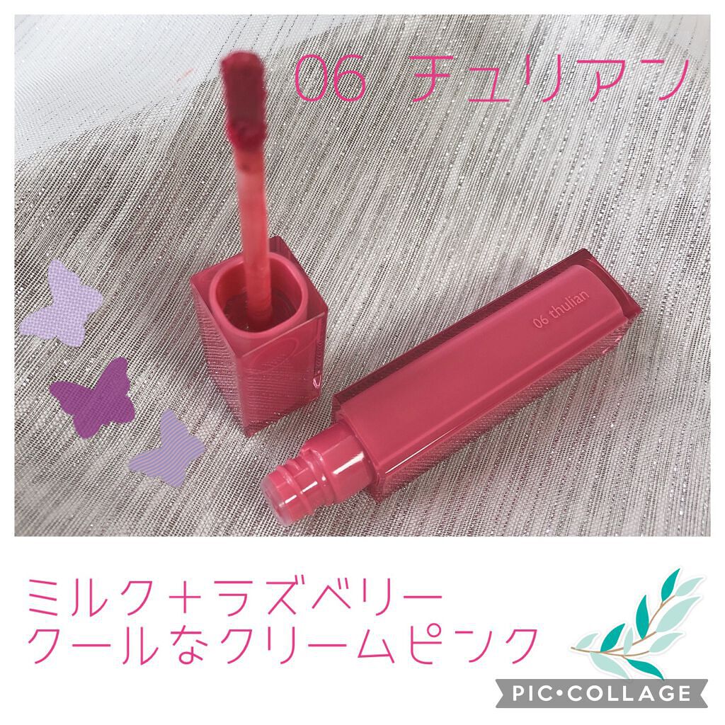 - <01 インコーラル> 水、ビスジグリセリルポリアシルアジペート-2、グリセリン、ジフェニルジメチコン、ジフェニルシロキシフェニルトリメチコン、ポリグリセリン-3、リンゴ酸ジイソステアリル、水添ポリイソブテン、ポリブテン、トリメチルシロキシフェニルジメチコン、変性アルコール、ポリソルベート60、イソノナン酸イソノニル、ペンチレングリコール、(アクリル酸ヒドロキシエチル/アクリロイルジメチルタウリンNa)コポ リマー、ラベンダーエキス、ハナハッカ花/葉/茎エキス、ローズマリーエキス、タイムエキス、ステアリン酸グリセリル、ステアリン酸PEG-100、スクワラン、ラウリルPEG-10トリス(トリメチルシロキシ)シリルエチルジメチコン、エチルヘキシルグリセリン、デキストリン、ステビオシド、イソステアリン酸ソルビタン、エチレンジアミンジコハク酸3Na、水酸化Al、ポリアクリル酸アンモニウム、BG、トコフェロール、フェノキシエタノール、香料、リモネン、酸化チタン、黄5、赤227、黄4、青1 <03 イフローズ> 水、ビスジグリセリルポリアシルアジペート-2、グリセリン、ジフェニルジメチコン、ジフェニルシロキシフェニルトリメチコン、ポリグリセリン-3、リンゴ酸ジイソステアリル、水添ポリイソブテン、ポリブテン、トリメチルシロキシフェニルジメチコン、変性アルコール、ポリソルベート60、イソノナン酸イソノニル、ペンチレングリコール、(アクリル酸ヒドロキシエチル/アクリロイルジメチルタウリンNa)コポリマー、ラベンダーエキス、ハナハッカ花/葉/茎エキス、ローズマリーエキス、タイムエキス、ステアリン酸グリセリル、ステアリン酸PEG-100、スクワラン、ラウリルPEG-10トリス(トリメチルシロキシ)シリルエチルジメチコン、エチルヘキシルグリセリン、デキストリン、ステビオシド、トリイソステアリン酸ポリグリセリル-2、イソステアリン酸ソルビタン、エチレンジアミンジコハク酸3Na、水酸化Al、ポリアクリル酸アンモニウム、BG、トコフェロール、フェノキシエタノール、香料、リモネン、酸化チタン、黄5、赤227、青1、黄4、赤218 <04 チリアップ> 水、ビスジグリセリルポリアシルアジペート-2、グリセリン、ジフェニルジメチコン、ジフェニルシロキシフェニルトリメチコン、ポリグリセリン-3、リンゴ酸ジイソステアリル、水添ポリイソブテン、ポリブテン、トリメチルシロキシフェニルジメチコン、変性アルコール、ポリソルベート60、イソノナン酸イソノニル、ペンチレングリコール、(アクリル酸ヒドロキシエチル/アクリロイルジメチルタウリンNa)コポ リマー、ラベンダーエキス、ハナハッカ花/葉/茎エキス、ローズマリーエキス、タイムエキス、ステアリン酸グリセリル、ステアリン酸PEG-100、スクワラン、ラウリルPEG-10トリス(トリメチルシロキシ)シリルエチルジメチコン、エチルヘキシルグリセリン、デキストリン、ステビオシド、イソステアリン酸ソルビタン、エチレンジアミンジコハク酸3Na、トコフェロール、BG、フェノキシエタノール、料、リモネン、黄5、赤227、黄4、青1 <06 チュリアン> 水、ビスジグリセリルポリアシルアジペート-2、グリセリン、ジフェニルジメチコン、ジフェニルシロキシフェニルトリメチコン、ポリグリセリン-3、リンゴ酸ジイソステアリル、水添ポリイソブテン、ポリブテン、トリメチルシロキシフェニルジメチコン、変性アルコール、ポリソルベート60、イソノナン酸イソノニル、ペンチレングリコール、(アクリル酸ヒドロキシエチル/アクリロイルジメチルタウリンNa)コポリマー、ラベンダーエキス、ハナハッカ花/葉/茎エキス、ローズマリーエキス、タイムエキス、ステアリン酸グリセリル、ステアリン酸PEG-100、スクワラン、ラウリルPEG-10トリス(トリメチルシロキシ)シリルエチルジメチコン、エチルヘキシルグリセリン、デキストリン、ステビオシド、イソステアリン酸ソルビタン、エチレンジアミンジコハク酸3Na、水酸化Al、ポリアクリル酸アンモニウム、BG、トコフェロール、フェノキシエタノール、香料、リモネン、酸化チタン、黄5、赤227、酸化鉄、黄4、赤218、青1 <08 ベリーディヴァイン> 水、ビスジグリセリルポリアシルアジペート-2、グリセリン、ジフェニルジメチコン、ジフェニルシロキシフェニルトリメチコン、ポリグリセリン-3、リンゴ酸ジイソステアリル、水添ポリイソブテン、ポリブテン、トリメチルシロキシフェニルジメチコン、変性アルコール、ポリソルベート60、イソノナン酸イソノニル、ペンチレングリコール、(アクリル酸ヒドロキシエチル/アクリロイルジメチルタウリンNa)コポリマー、ラベンダーエキス、ハナハッカ花/葉/茎エキス、ローズマリーエキス、タイムエキス、ステアリン酸グリセリル、ステアリン酸PEG-100、スクワラン、ラウリルPEG-10トリス(トリメチルシロキシ)シリルエチルジメチコン、エチルヘキシルグリセリン、イソステアリン酸ソルビタン、デキストリン、ステビオシド、エチレンジアミン