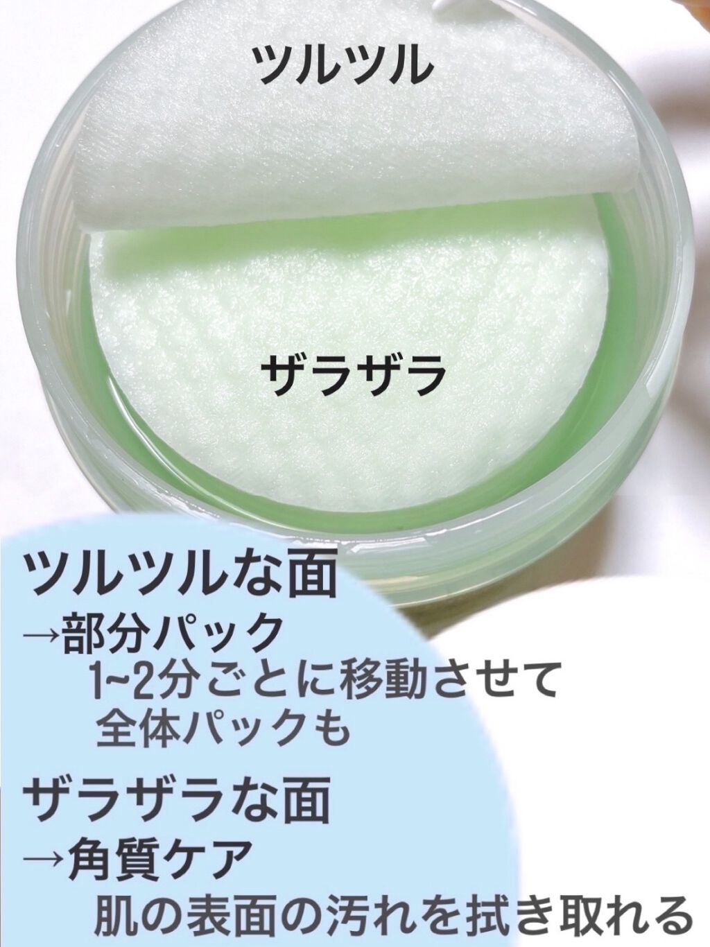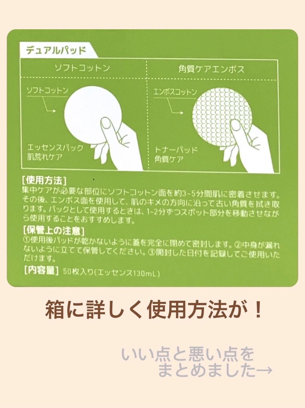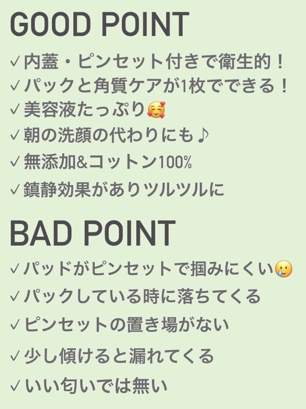 これを使い始めてからブツブツが減り、 すべすべになりました✌️ 2、3日使ったらニキビが無くなりました👏 美容液がひたひた!!! パッドが無くなったらコットンに 浸せて使える! ピンセット付きで衛生的! 置く場所がないため、元々入っていた袋に 入れて、箱にパッドと一緒に入れてます! 無添加&コットン100% お肌が荒れにくく、敏感肌さんにも💕 1枚でパックと角質オフができる! 表裏 違う機能があるため使い分けれる🙆♀️ 朝の洗顔代わりにできる これを使うとスッキリします! ササッとできるので朝、時間が無い人にも👍 鎮静効果がある 何回か使っていると赤みが引いていきます! 仕上がりがサラッとする 私はもちもちするよりサラッとする方が 好きなので気に入ってます❤ 液が漏れやすい 内蓋が付いてますが少し傾けると漏れます😅 ピンセットはありがたいけど掴みにくい! パッドが分厚いからか掴みにくいです🙂