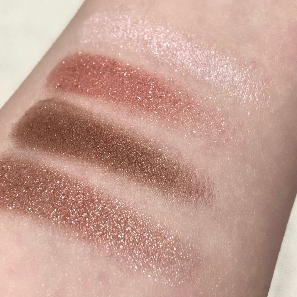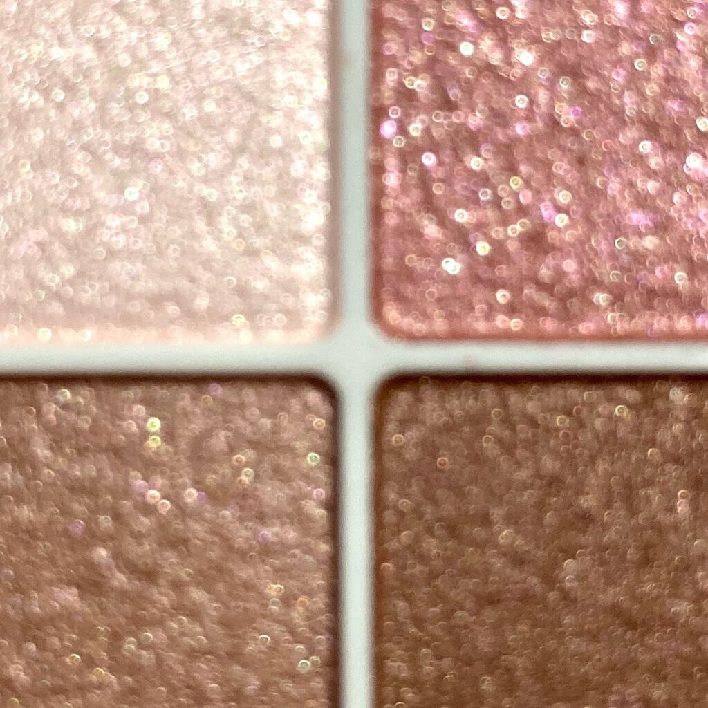 プライマーを使って、密度の高い感じのブラシで 左下ローズを置くように塗る。 ぼかすのは境目だけにして、しっかり色を出す。 右下のダークブラウンと思っていた濃い色は メイクしてみたら結構紫っぽく出たんですが これがまぁくすみ感が強くて…w くすみは何より苦手だよ😂😂 右上のラメはぺかっと光るのがとっても良い!!🤩 割とシンプルなメイクになるな~と思うけど しっかり色出せたので無事使っていけそうです💃🏼💓