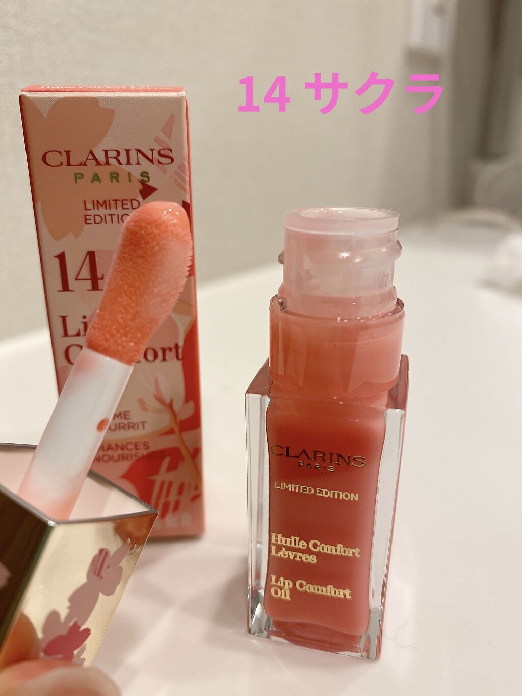 CLARINS コンフォート リップオイル インテンス 09 ウォームローズ 限定カラー 14 サクラ オンライン限定復刻 色落ちしにくい 肌なじみの良いピンクベージュ 塗った瞬間潤ってプルプルになりました💋 14はおうち用にしようかなと思ってます😊
